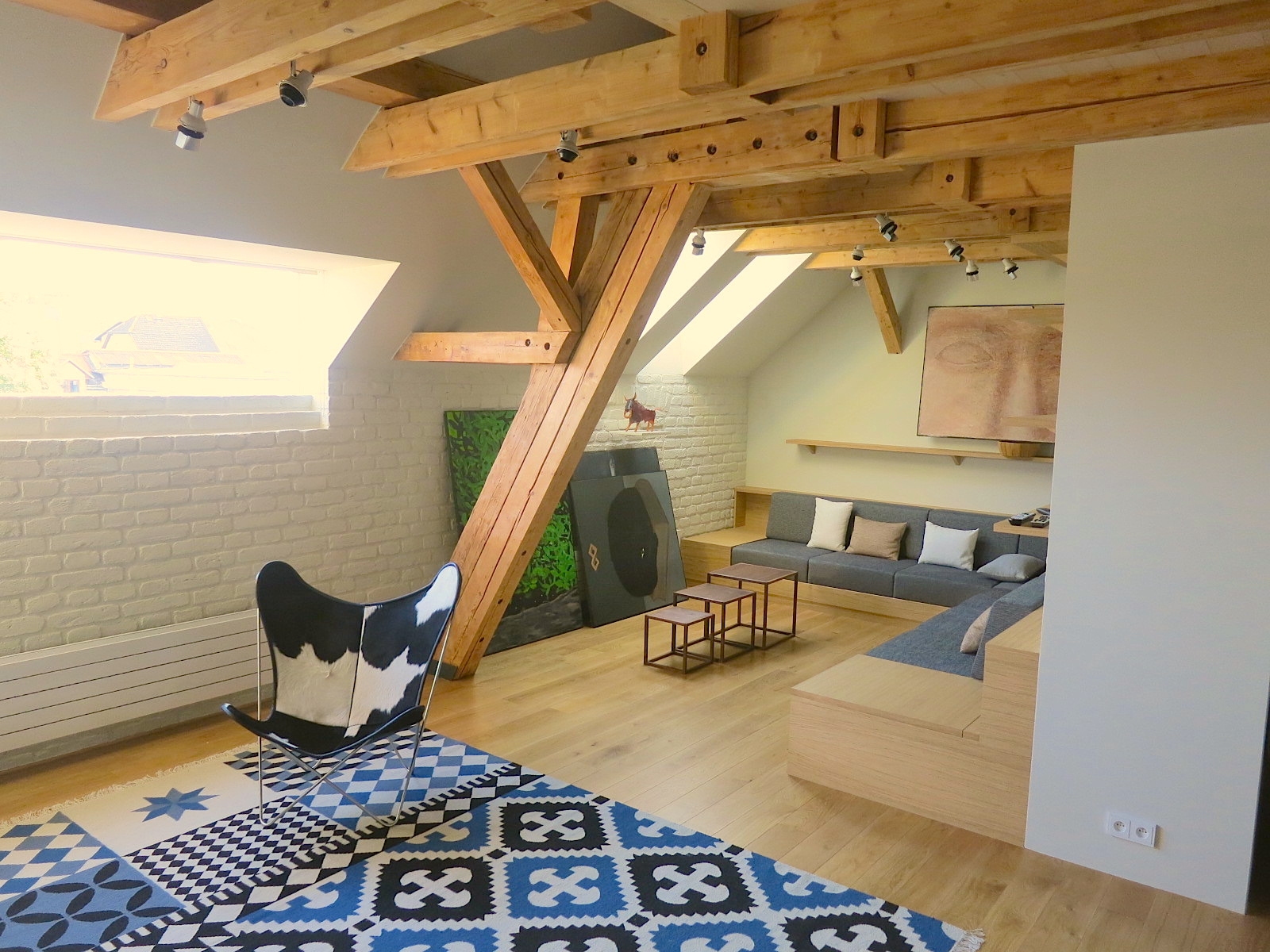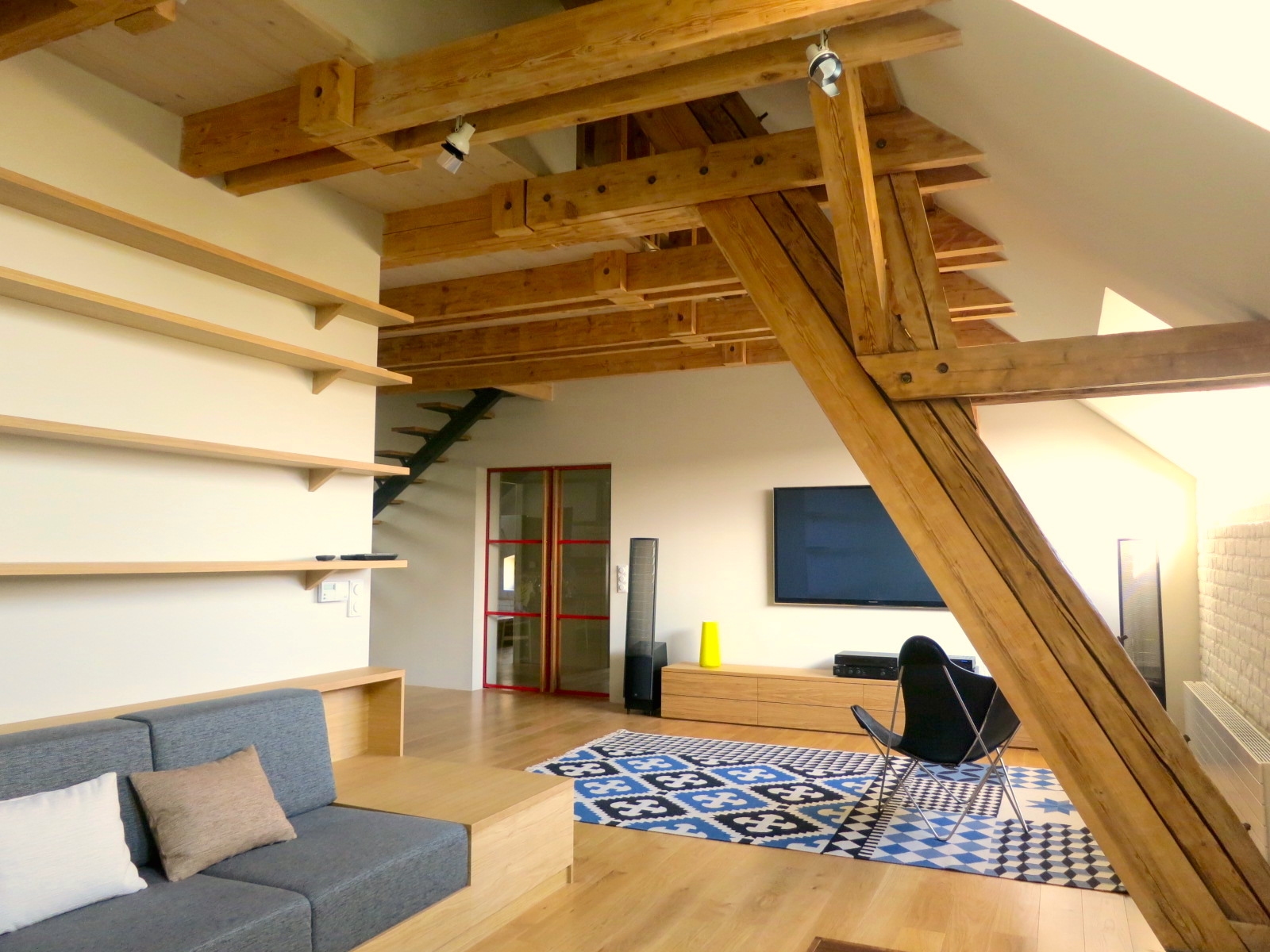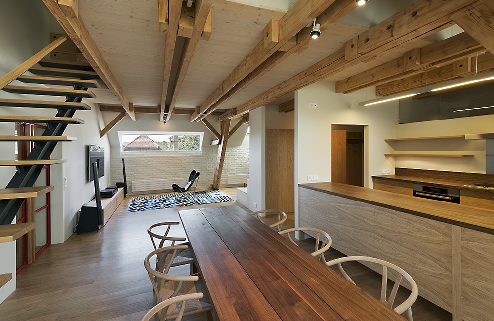 Velký podkrovní prostor nad objektem bývalého statku „Bejkárny“ poblíž centra Benešova umožňoval vestavbu dvoupodlažního bytu. Dole je kuchyň s dlouhým jídelním stolem a obývacím koutem s vestavěnou rohovou sedačkou. Za prosklenými ocelovými červenými posuvnými dveřmi je velká koupelna, šatna a ložnice. Nahoře jsou ještě dva pokoje pro hosty s koupelnou. Stará omítka obvodových zdí byla odstraněna a původní cihly natřeny bílou barvou, původní krov očištěn, vestavěno lehké ocelové schodiště s dřevěnými nášlapy. Na podlaze jsou dubová prkna. Prostor je přisvětlen původními nízkými okýnky se zaobleným nadpražím, ke kterým bylo doplněno bezrámové okno v obývací části a několik střešních oken.