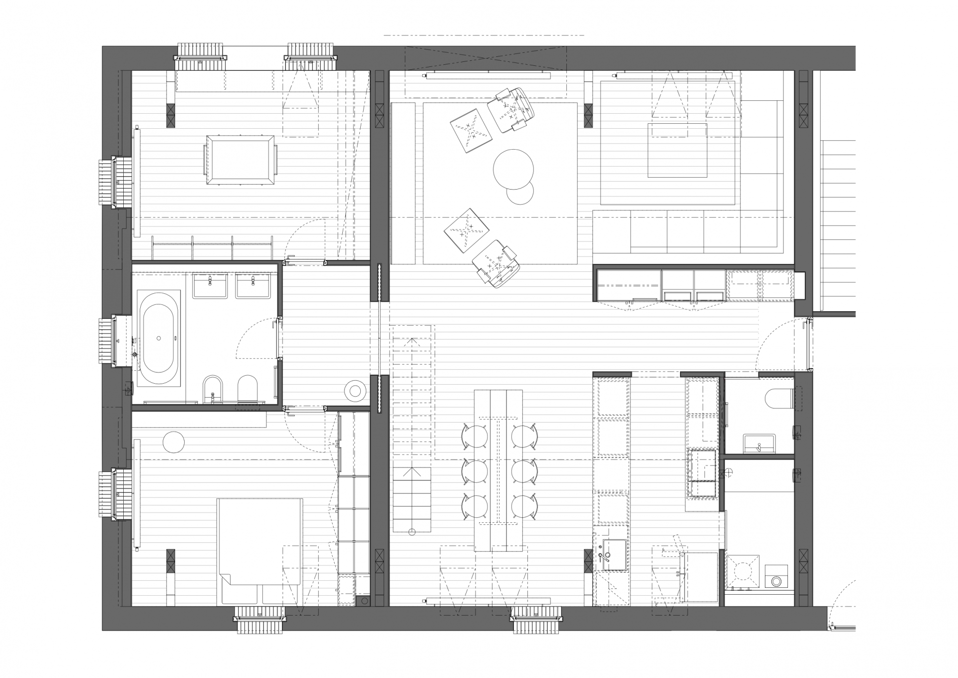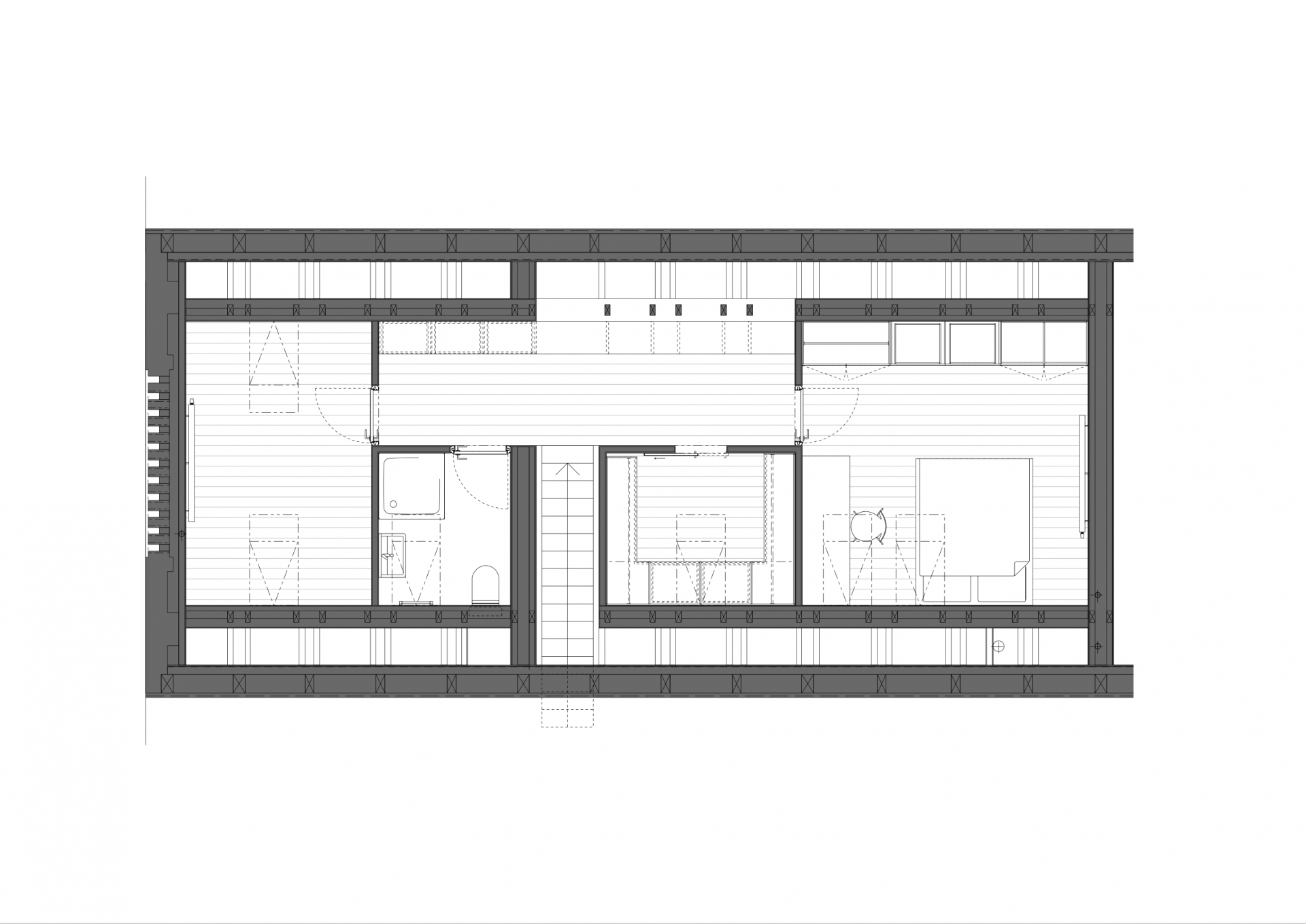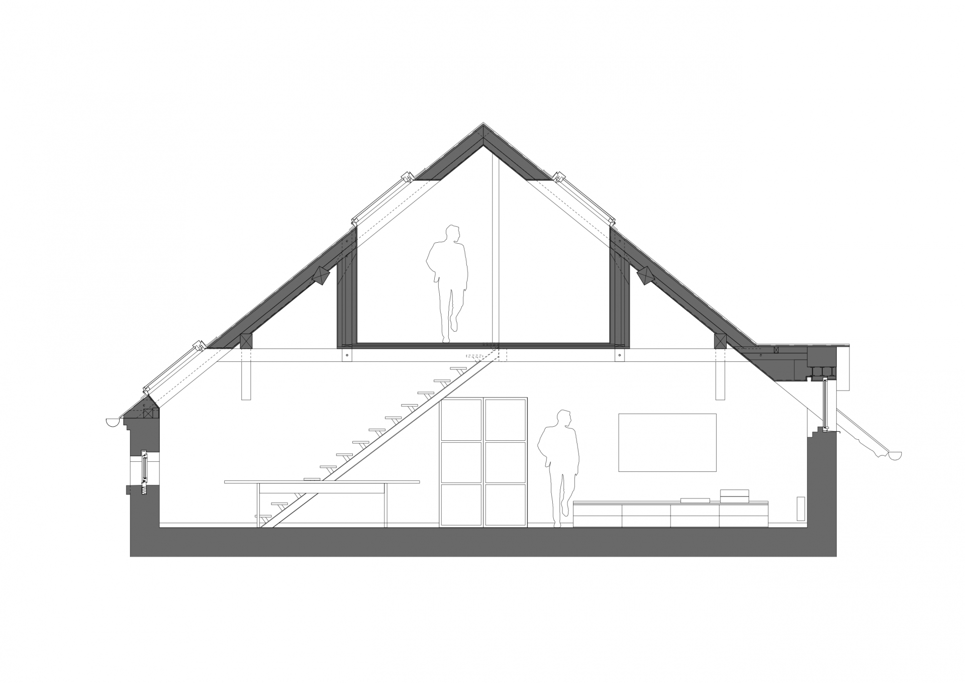 Velký podkrovní prostor nad objektem bývalého statku „Bejkárny“ poblíž centra Benešova umožňoval vestavbu dvoupodlažního bytu. Dole je kuchyň s dlouhým jídelním stolem a obývacím koutem s vestavěnou rohovou sedačkou. Za prosklenými ocelovými červenými posuvnými dveřmi je velká koupelna, šatna a ložnice. Nahoře jsou ještě dva pokoje pro hosty s koupelnou. Stará omítka obvodových zdí byla odstraněna a původní cihly natřeny bílou barvou, původní krov očištěn, vestavěno lehké ocelové schodiště s dřevěnými nášlapy. Na podlaze jsou dubová prkna. Prostor je přisvětlen původními nízkými okýnky se zaobleným nadpražím, ke kterým bylo doplněno bezrámové okno v obývací části a několik střešních oken.