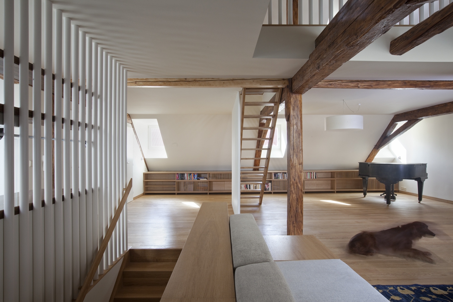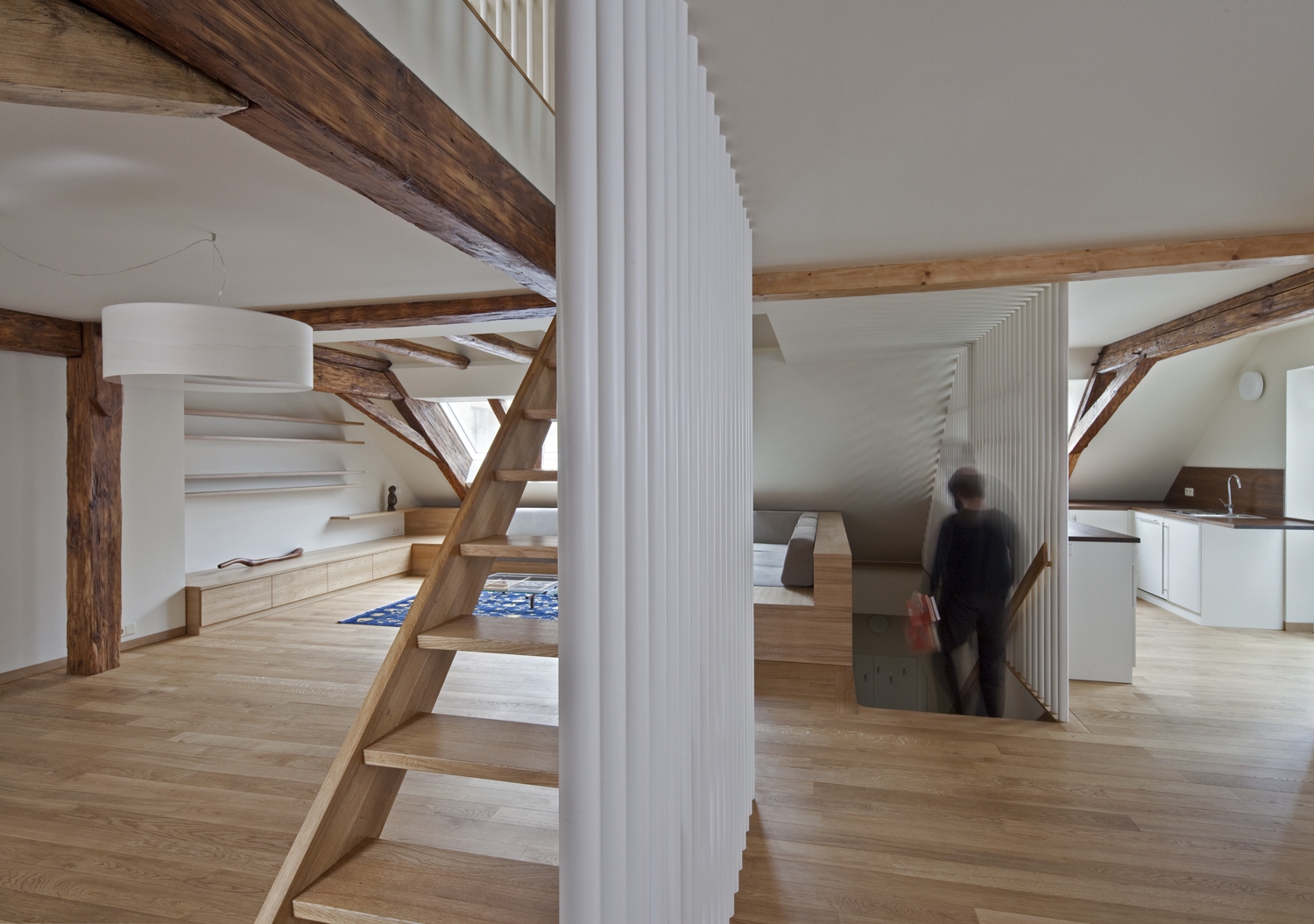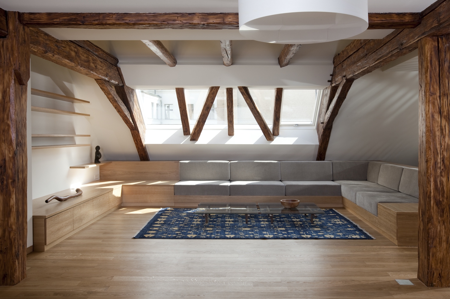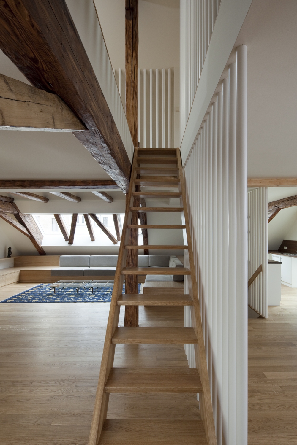 Dvoupodlažní podkrovní byt s dřevěnou k-cí z 19.století stojí v centru Litoměřic nedaleko hlavního náměstí. Prostor je členěný převážně poloprůhlednými prvky interiéru, aby zůstal čitelný ve svém celku. V interiéru se uplatňuje kombinace původní dřevěné konstrukce krovu a současného nábytku provedeného na míru. Pásové střešní okno prosvětluje a přináší průhledy do okolní střešní krajiny.
