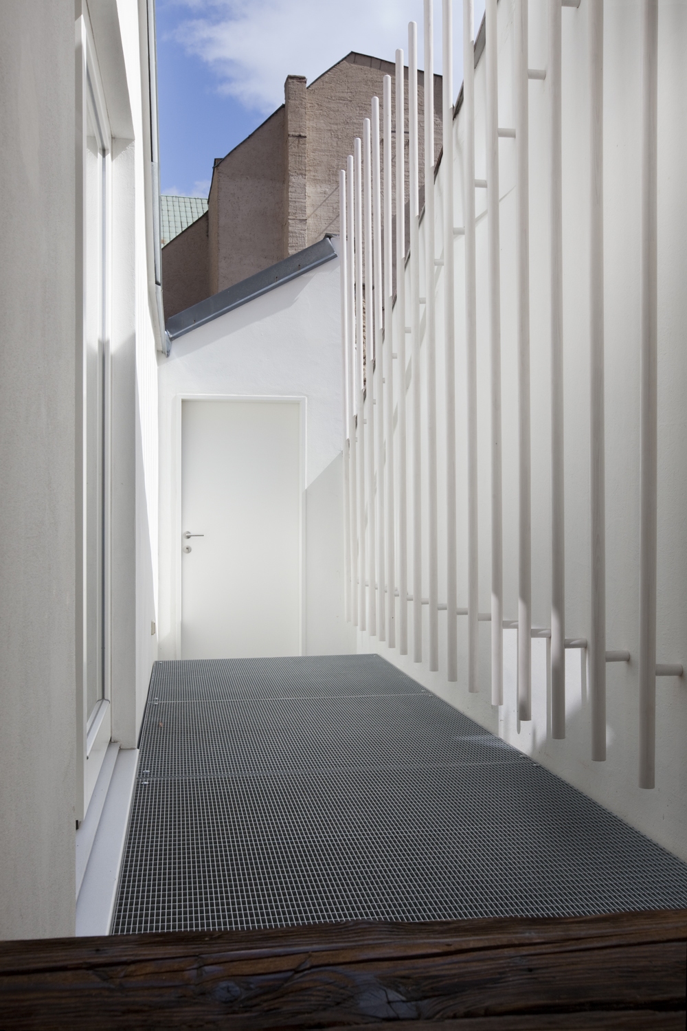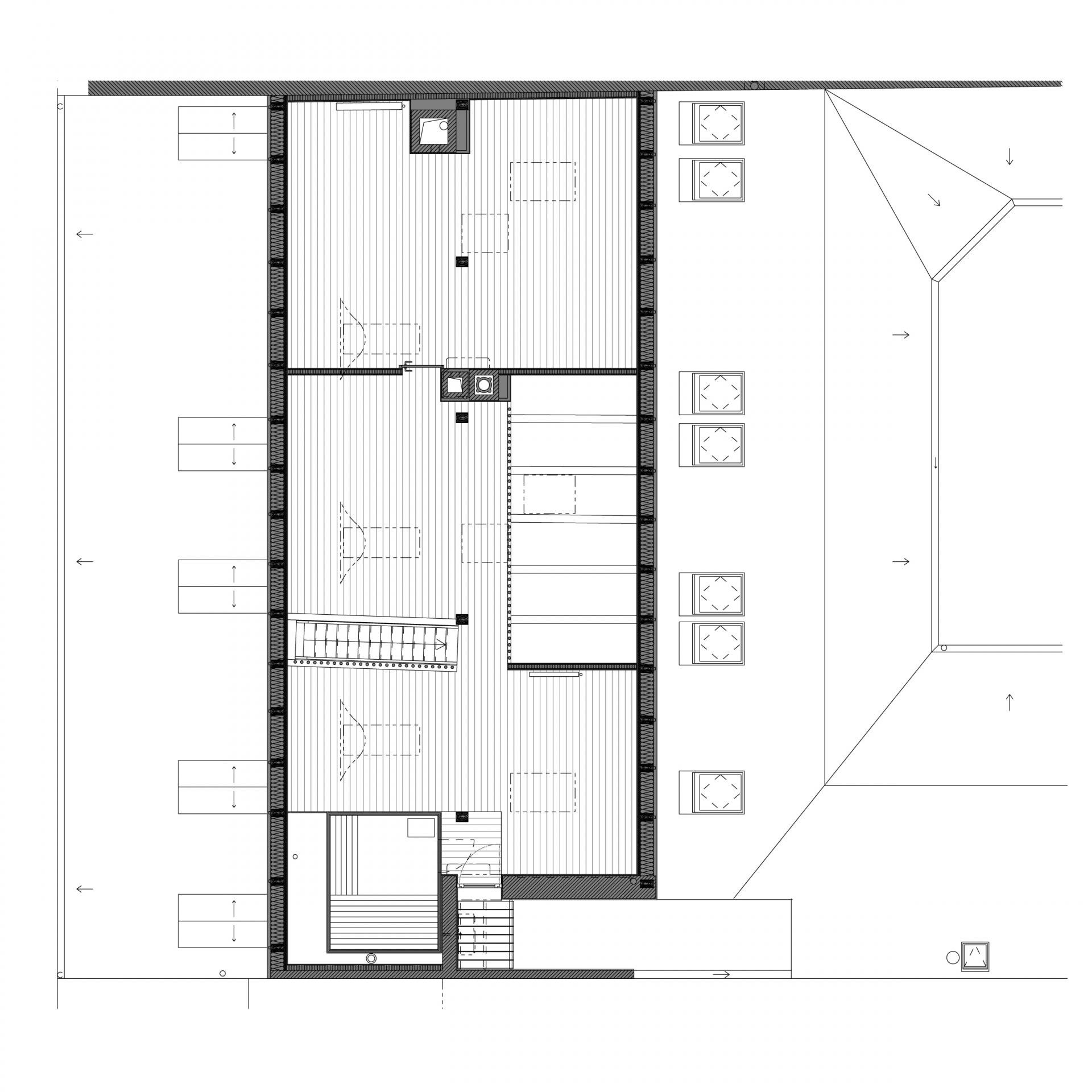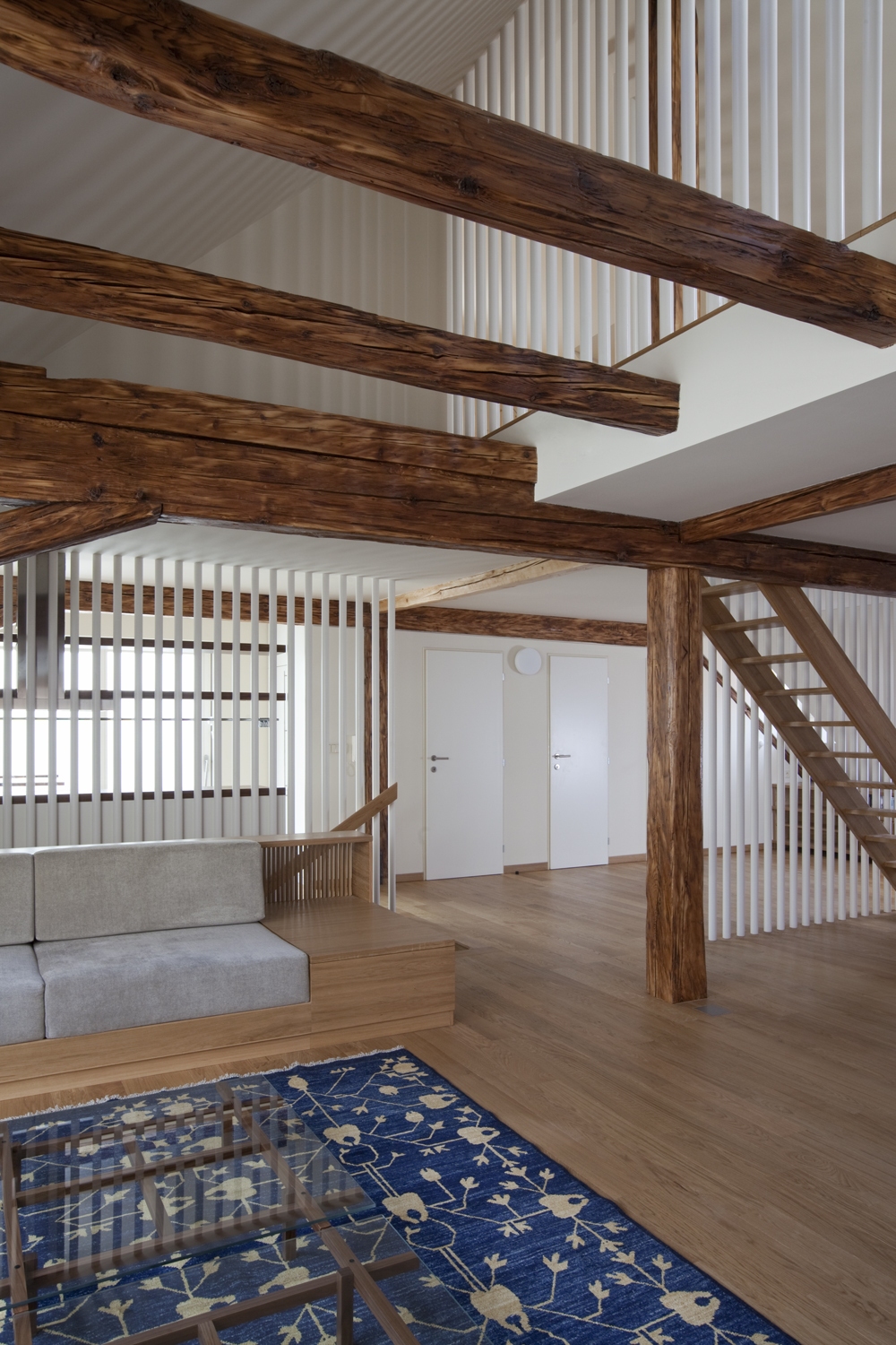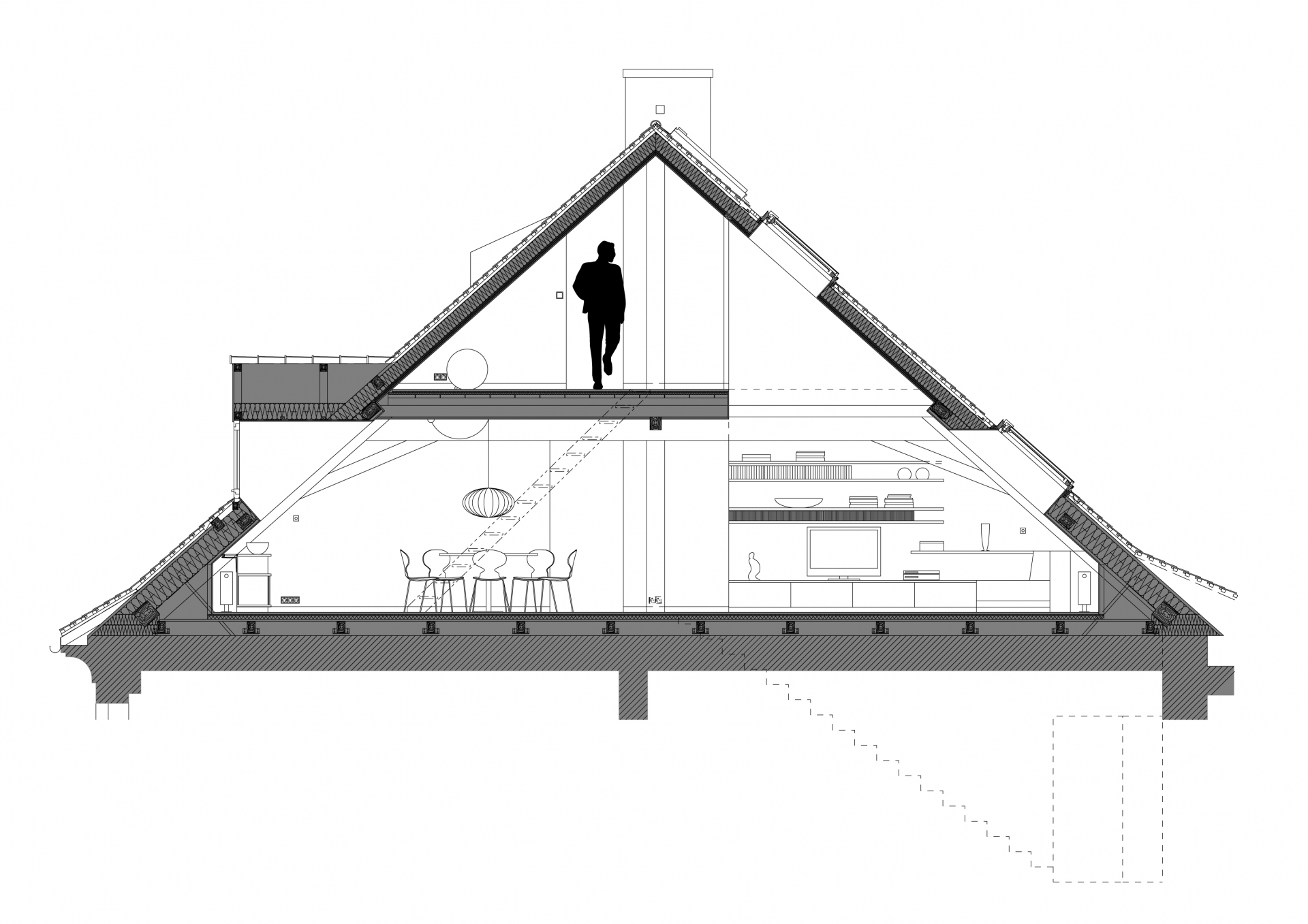 Dvoupodlažní podkrovní byt s dřevěnou k-cí z 19.století stojí v centru Litoměřic nedaleko hlavního náměstí. Prostor je členěný převážně poloprůhlednými prvky interiéru, aby zůstal čitelný ve svém celku. V interiéru se uplatňuje kombinace původní dřevěné konstrukce krovu a současného nábytku provedeného na míru. Pásové střešní okno prosvětluje a přináší průhledy do okolní střešní krajiny.