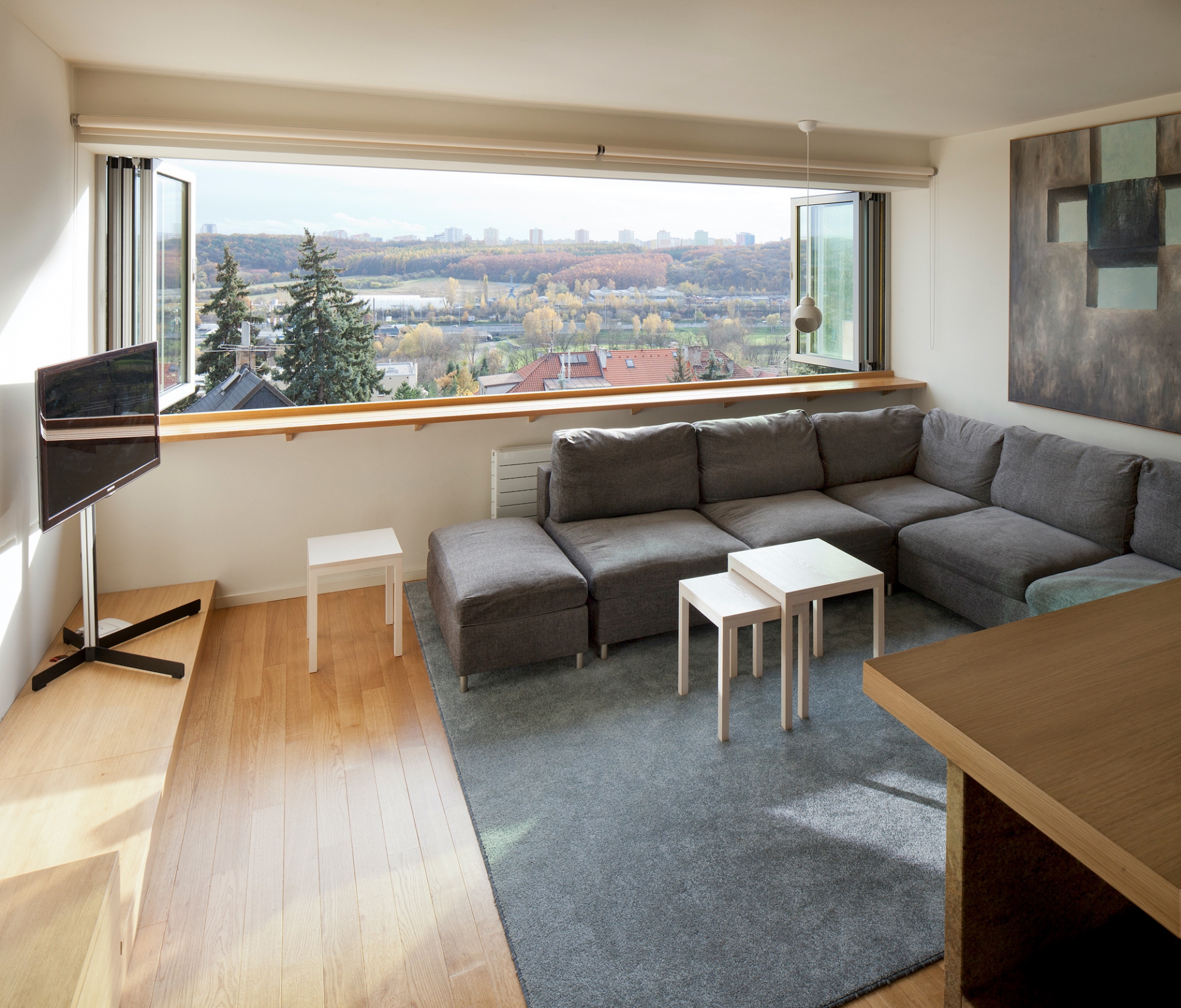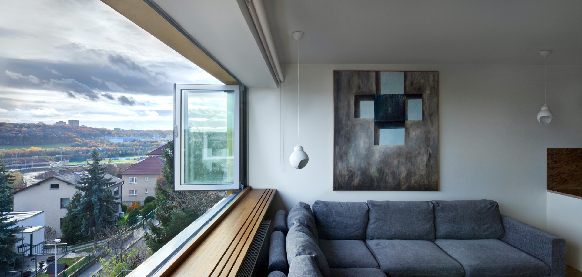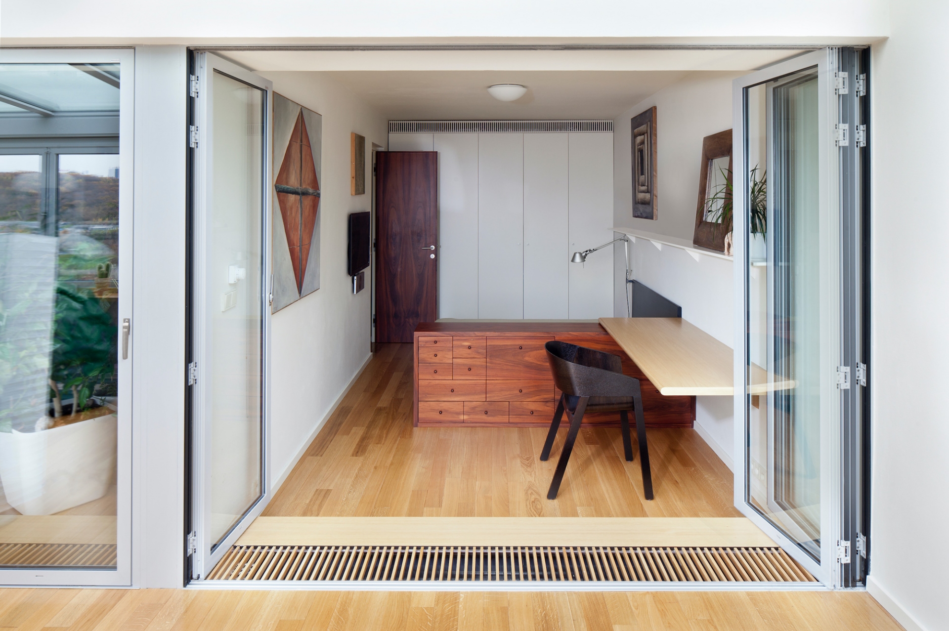 Jihozápadně orientovaný byt se zimní zahradou v terasovém domě z 80-tých let v Praze-Krči s výhledem do údolí. Kompletní rekonstrukce, která zachovává původní počet ložnic a rozšiřuje obytný prostor o celoroční užívání kryté terasy. V ložnicích byly vybourány parapety a byly nahrazeny skládacími francouzskými okny. Průběžná okna v obývacím pokoji a kryté terase byla nahrazena skládacími s otevíráním ven. Okna tak po otevření nabízí nerušený výhled. Změna zimní zahrady na obytnou místnost si vyžádala nucenou výměnu vzduchu v ložnicích. Interiér je vybaven autorským nábytkem se sbírkou obrazů převážně od Oldřicha Tichého a několika svítidly od Alvara Aalta.