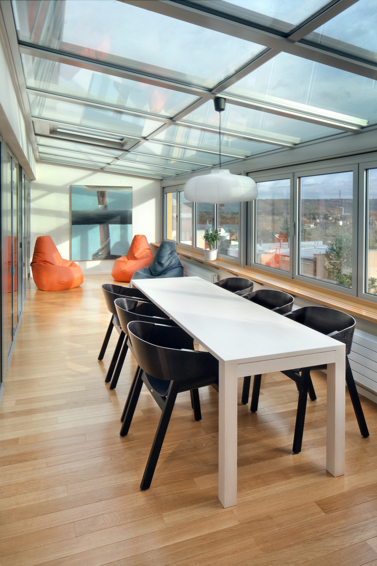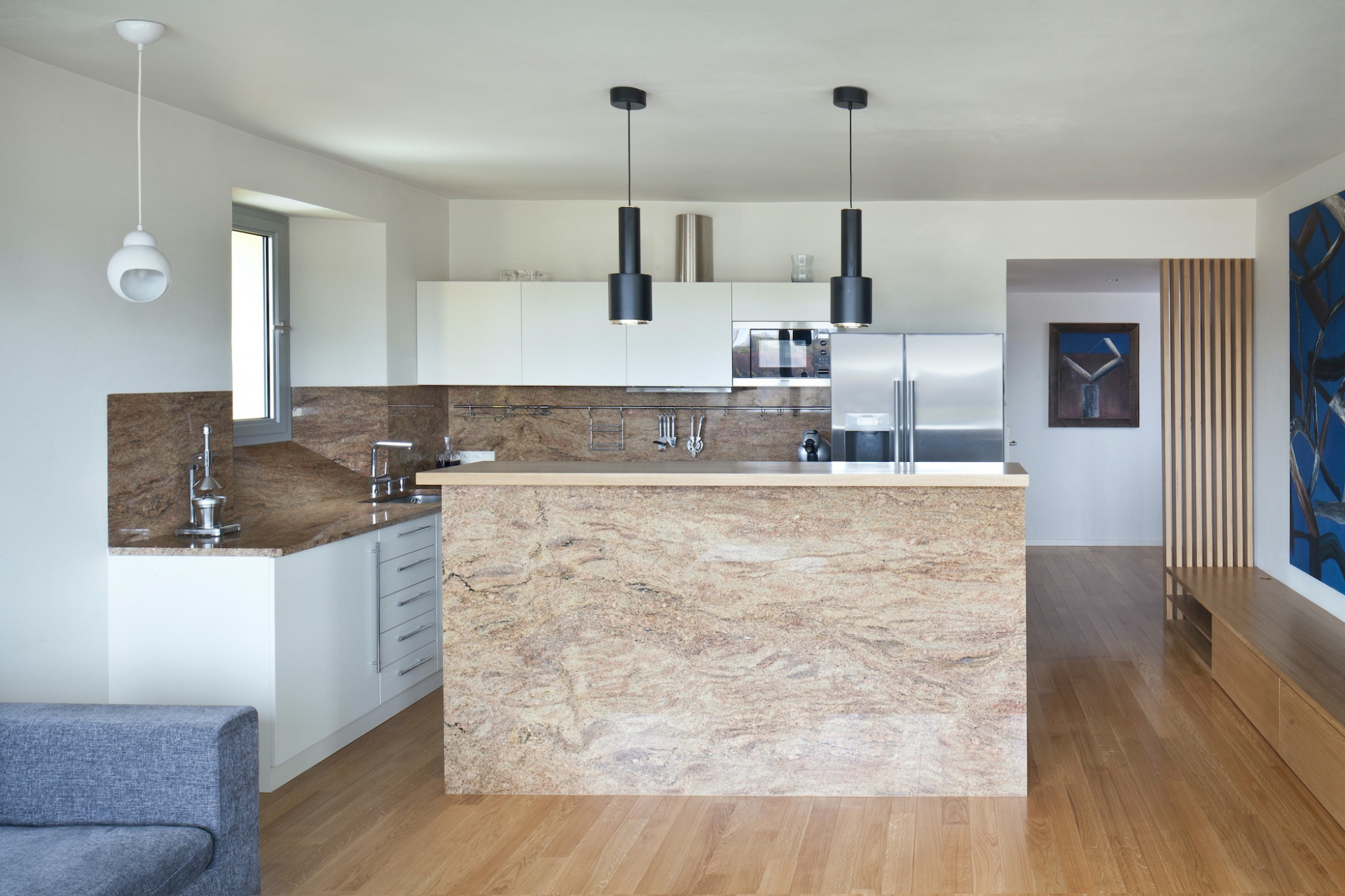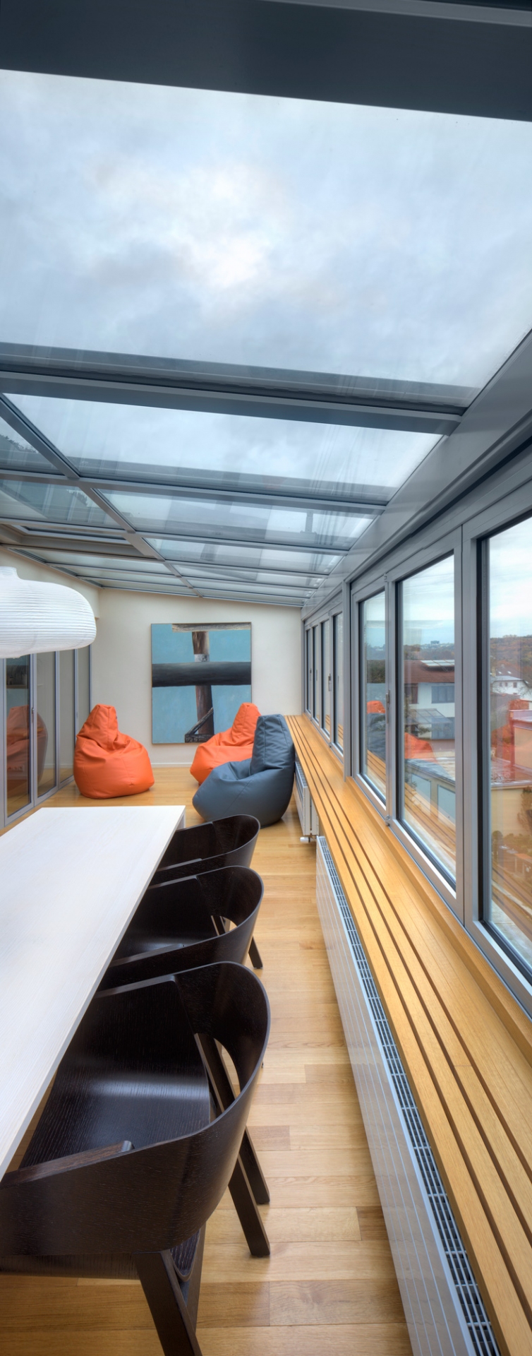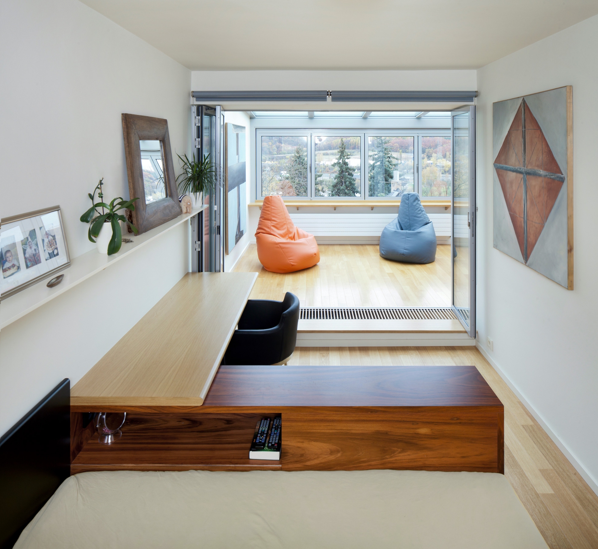 Jihozápadně orientovaný byt se zimní zahradou v terasovém domě z 80-tých let v Praze-Krči s výhledem do údolí. Kompletní rekonstrukce, která zachovává původní počet ložnic a rozšiřuje obytný prostor o celoroční užívání kryté terasy. V ložnicích byly vybourány parapety a byly nahrazeny skládacími francouzskými okny. Průběžná okna v obývacím pokoji a kryté terase byla nahrazena skládacími s otevíráním ven. Okna tak po otevření nabízí nerušený výhled. Změna zimní zahrady na obytnou místnost si vyžádala nucenou výměnu vzduchu v ložnicích. Interiér je vybaven autorským nábytkem se sbírkou obrazů převážně od Oldřicha Tichého a několika svítidly od Alvara Aalta.