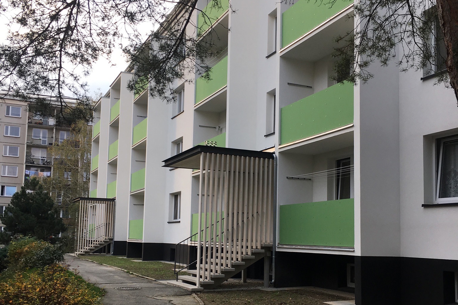 Kompletní revitalizace obvodového pláště panelového domu v Rožnově pod Radhoštěm. Nové posuvné zasklení lodžií. Nové vstupní prostory do domu. Cenový rámec realizace byl dodržen dle podmínek investora, vzhled a kvalita venkovního pláště nesrovnatelná s původním „panelákovým standardem“.