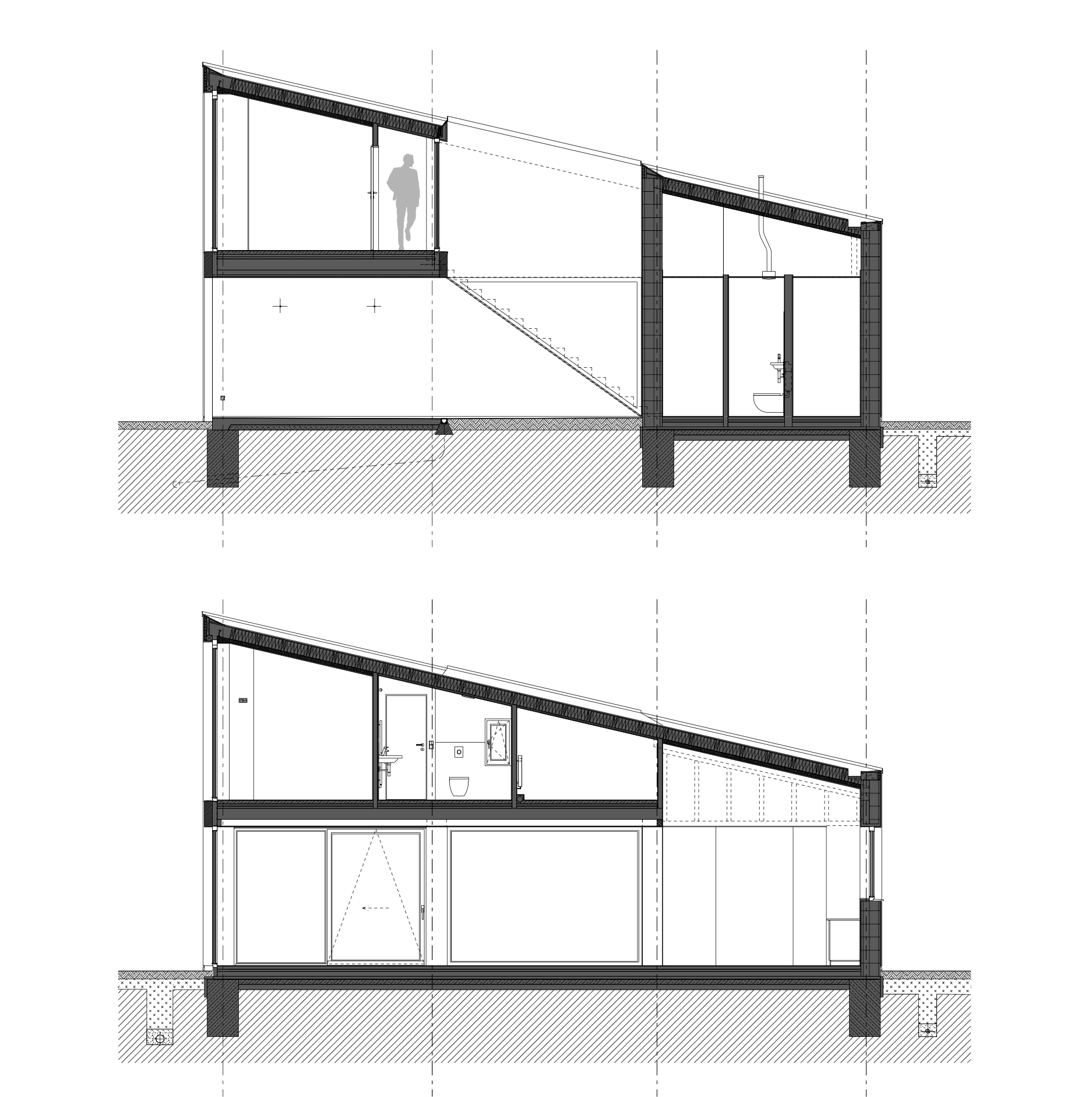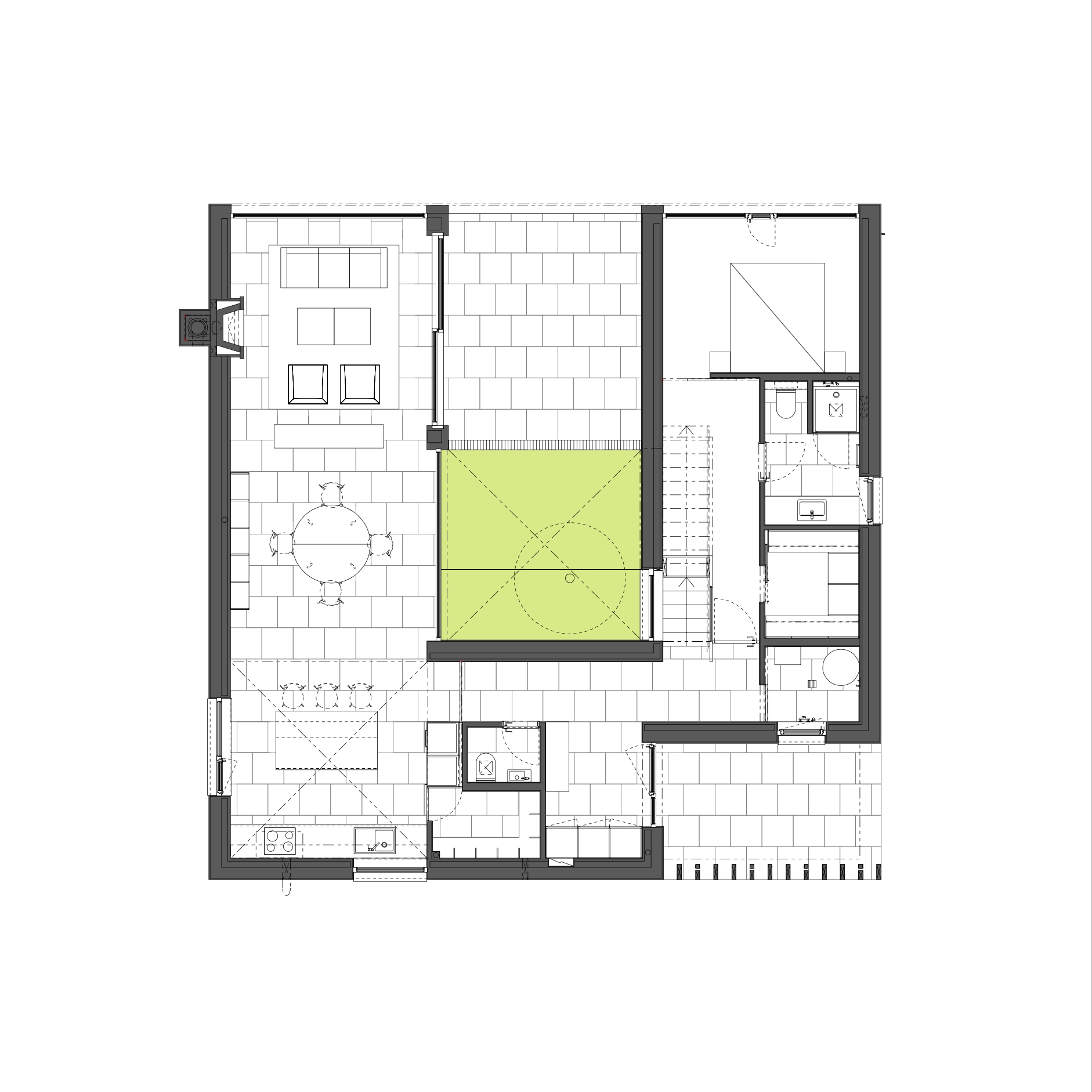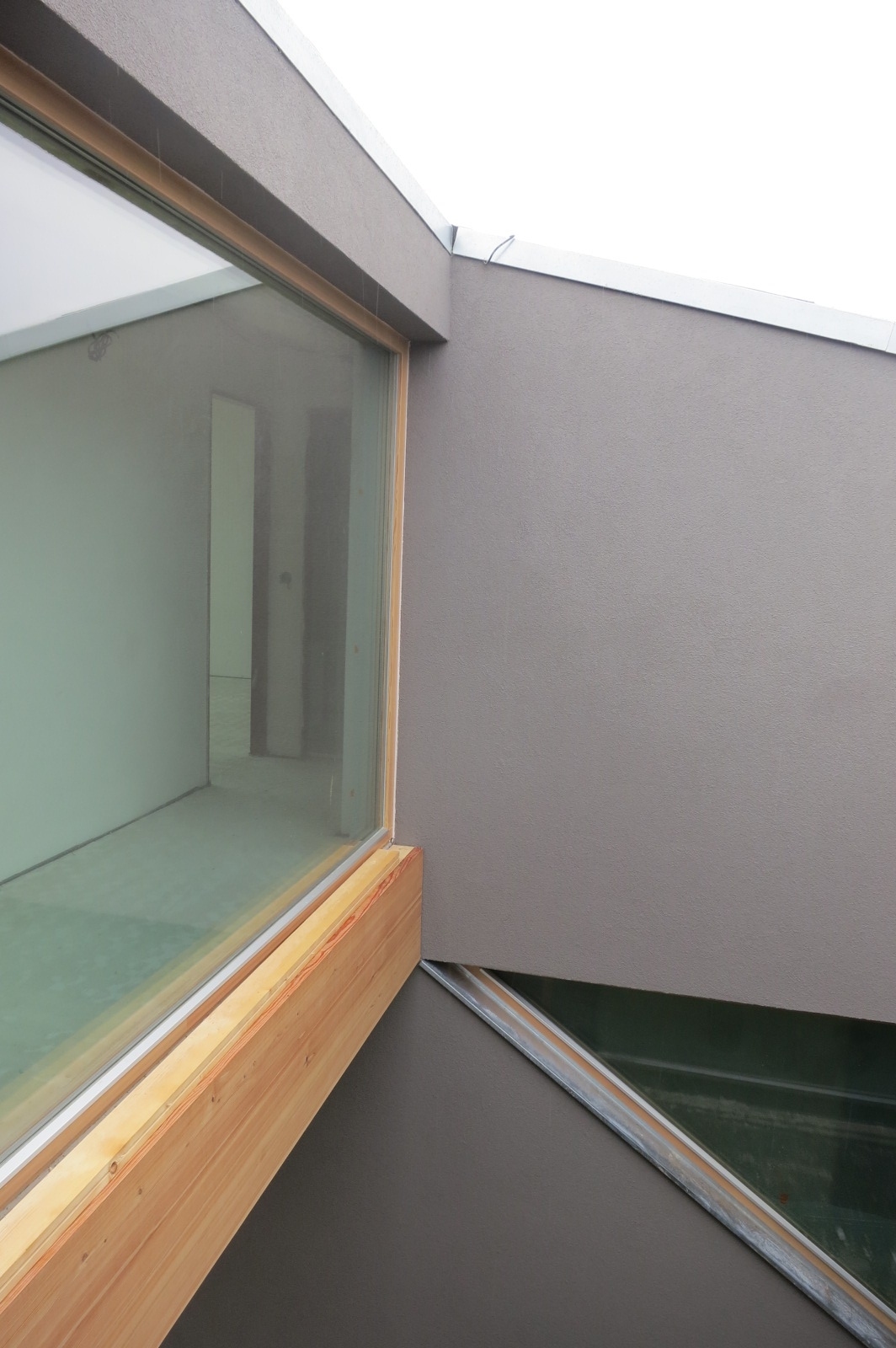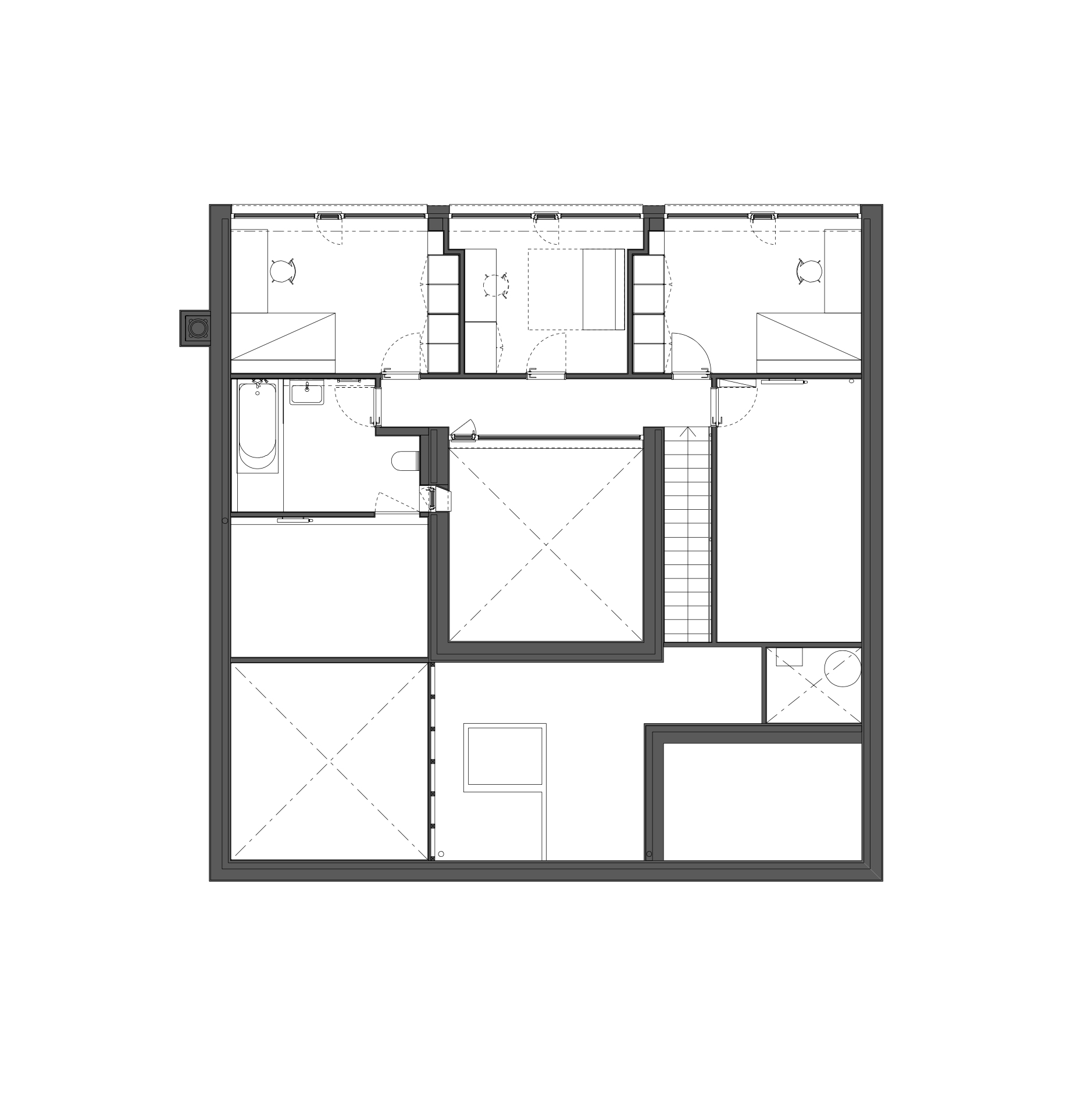 Individuální rodinný dům v okrajové zástavbě Benešova na rovinatém jižním pozemku. Výhled na pole, louku, ale i průmyslový objekt strojírenské firmy. Na horizontu Černý les. Dům má půdorys ve tvaru U, uprostřed atrium s terasou, která je krytá podlahou patra. Z ulice je dům uzavřený, je vidět pouze vstup a okno do kuchyně. Velká okna a prostorové průhledy jsou uplatněna směrem do zahrady a přes atrium uprostřed domu.