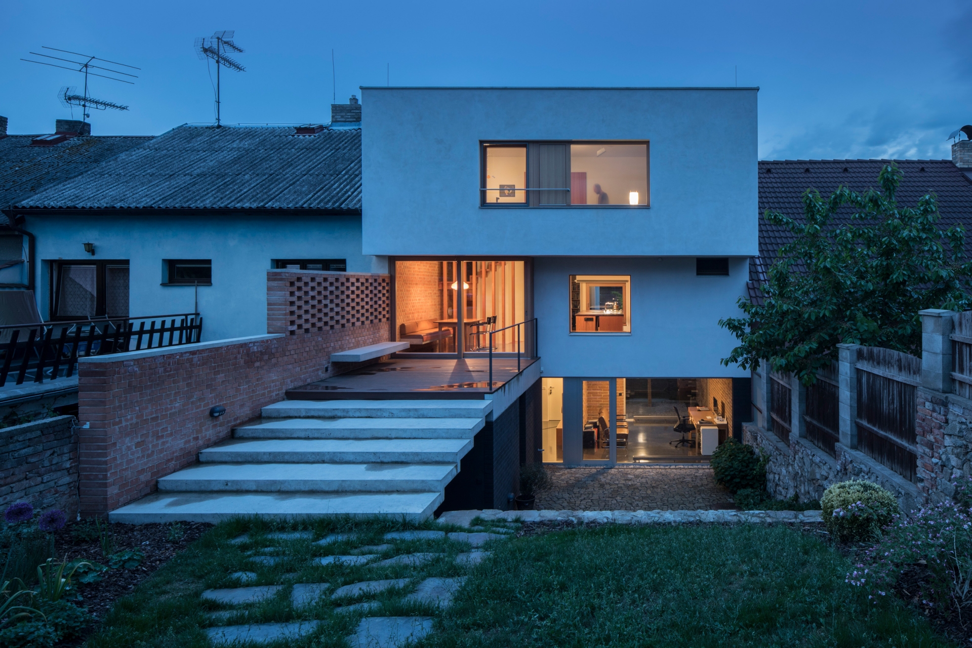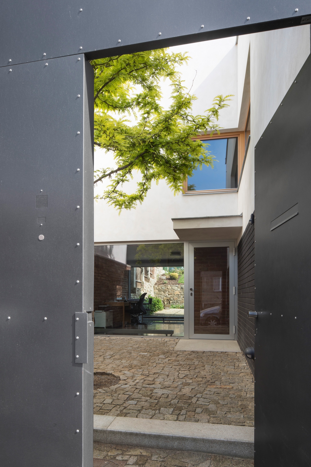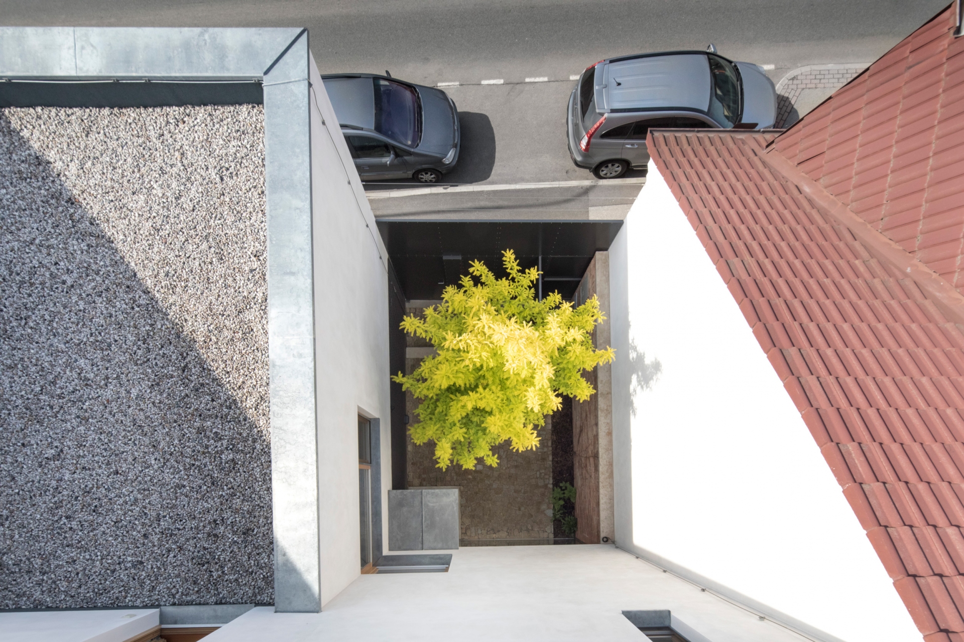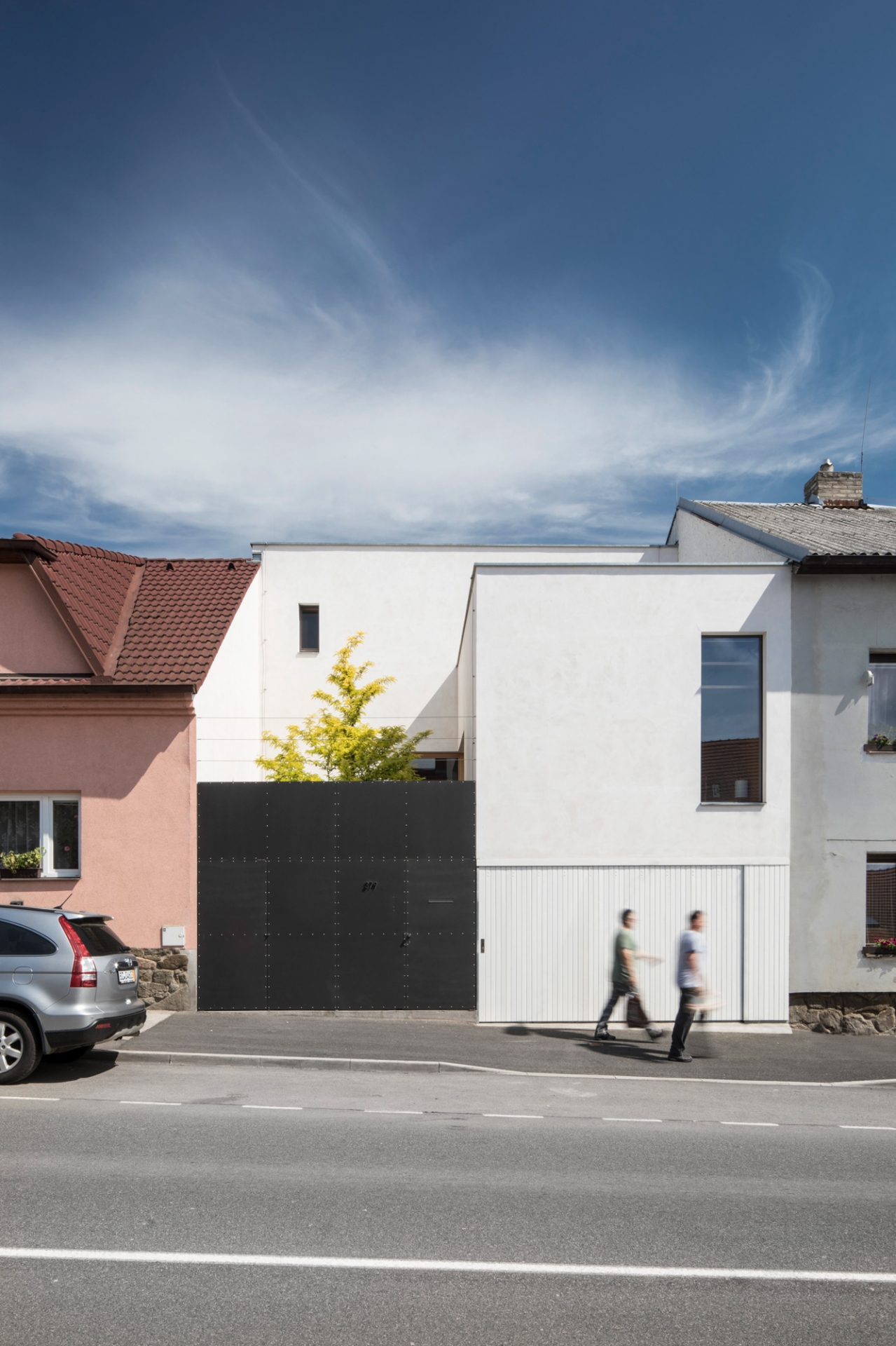 Stavět dům v proluce bylo naším snem. Po koupi starého řadového domu, který jsme pak zbourali, v jedné z mála lokalit Benešova s původní zástavbou poblíž středu města, jsme konečně mohli začít s jeho návrhem. Koncept domu se zrodil ještě ten den, kdy jsme si pozemek poprvé prohlédli a v podstatě už se nezměnil. Na ateliéru (příležitosném pokoji pro hosty), garáži a zázemí domu je posazena obytná část s polozapuštěným a převýšeným obývacím pokojem, kuchyní a jídelnou propojenou se zahradou a nad tím klidová část - koupelna a dvě ložnice obrácené do zahrad. Uliční fronta stávajících domů má jen jedno společné a to, že každý je zcela jiný. I proto jsme se rozhodli prolomit část hmoty průčelí ve prospěch vstupního dvorku. Ten poskytuje zklidněný vstup do domu, příjemné průhledy z ateliéru a v patře odstup obytné části od ulice s přirozeným stíněním jižního sluníčka korunou našeho stromu. Dvůr od ulice dělí plechová brána. Jednotlivé části domu záměrně výškově navazují na okolní římsy a hřebeny a utváří řád v protiváze k prolomení hmoty v ulici. Součástí domu je i původní kamenný sklípek.