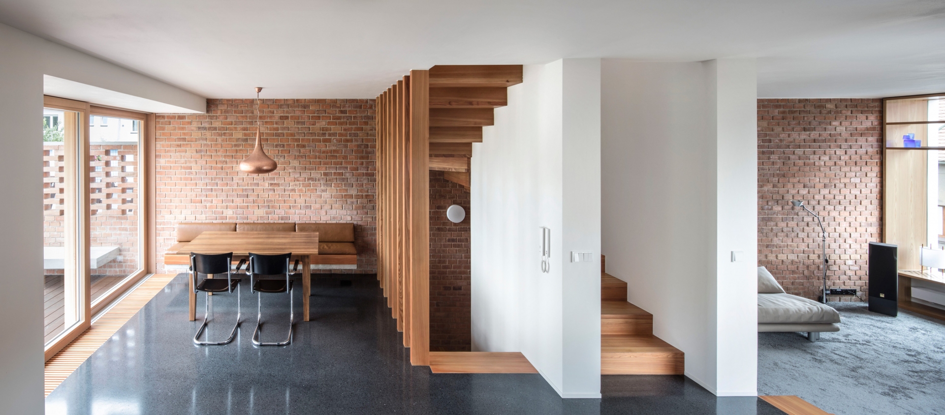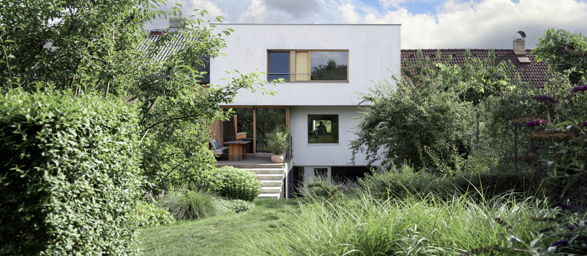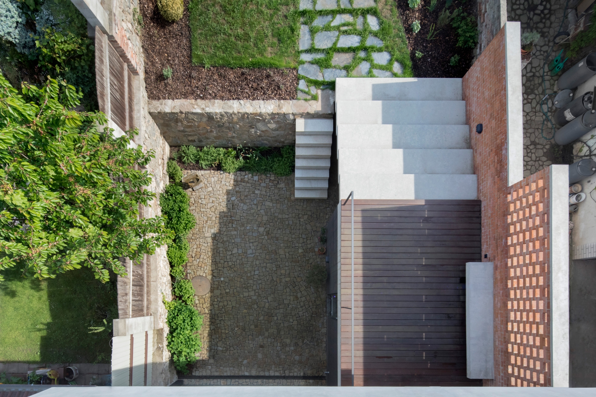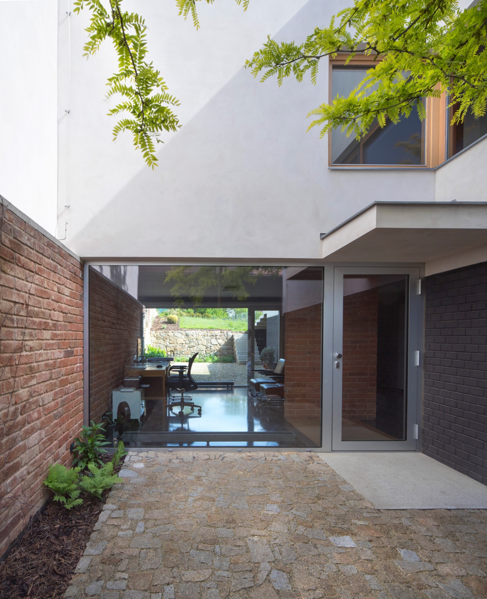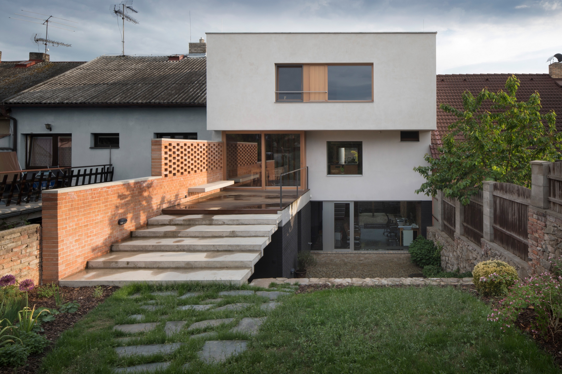 Stavět dům v proluce bylo naším snem. Po koupi starého řadového domu, který jsme pak zbourali, v jedné z mála lokalit Benešova s původní zástavbou poblíž středu města, jsme konečně mohli začít s jeho návrhem. Koncept domu se zrodil ještě ten den, kdy jsme si pozemek poprvé prohlédli a v podstatě už se nezměnil. Na ateliéru (příležitosném pokoji pro hosty), garáži a zázemí domu je posazena obytná část s polozapuštěným a převýšeným obývacím pokojem, kuchyní a jídelnou propojenou se zahradou a nad tím klidová část - koupelna a dvě ložnice obrácené do zahrad. Uliční fronta stávajících domů má jen jedno společné a to, že každý je zcela jiný. I proto jsme se rozhodli prolomit část hmoty průčelí ve prospěch vstupního dvorku. Ten poskytuje zklidněný vstup do domu, příjemné průhledy z ateliéru a v patře odstup obytné části od ulice s přirozeným stíněním jižního sluníčka korunou našeho stromu. Dvůr od ulice dělí plechová brána. Jednotlivé části domu záměrně výškově navazují na okolní římsy a hřebeny a utváří řád v protiváze k prolomení hmoty v ulici. Součástí domu je i původní kamenný sklípek.