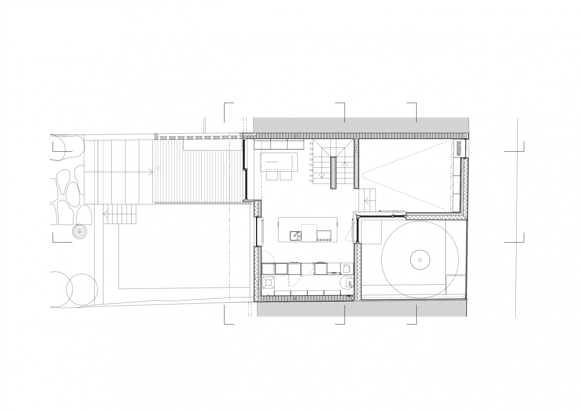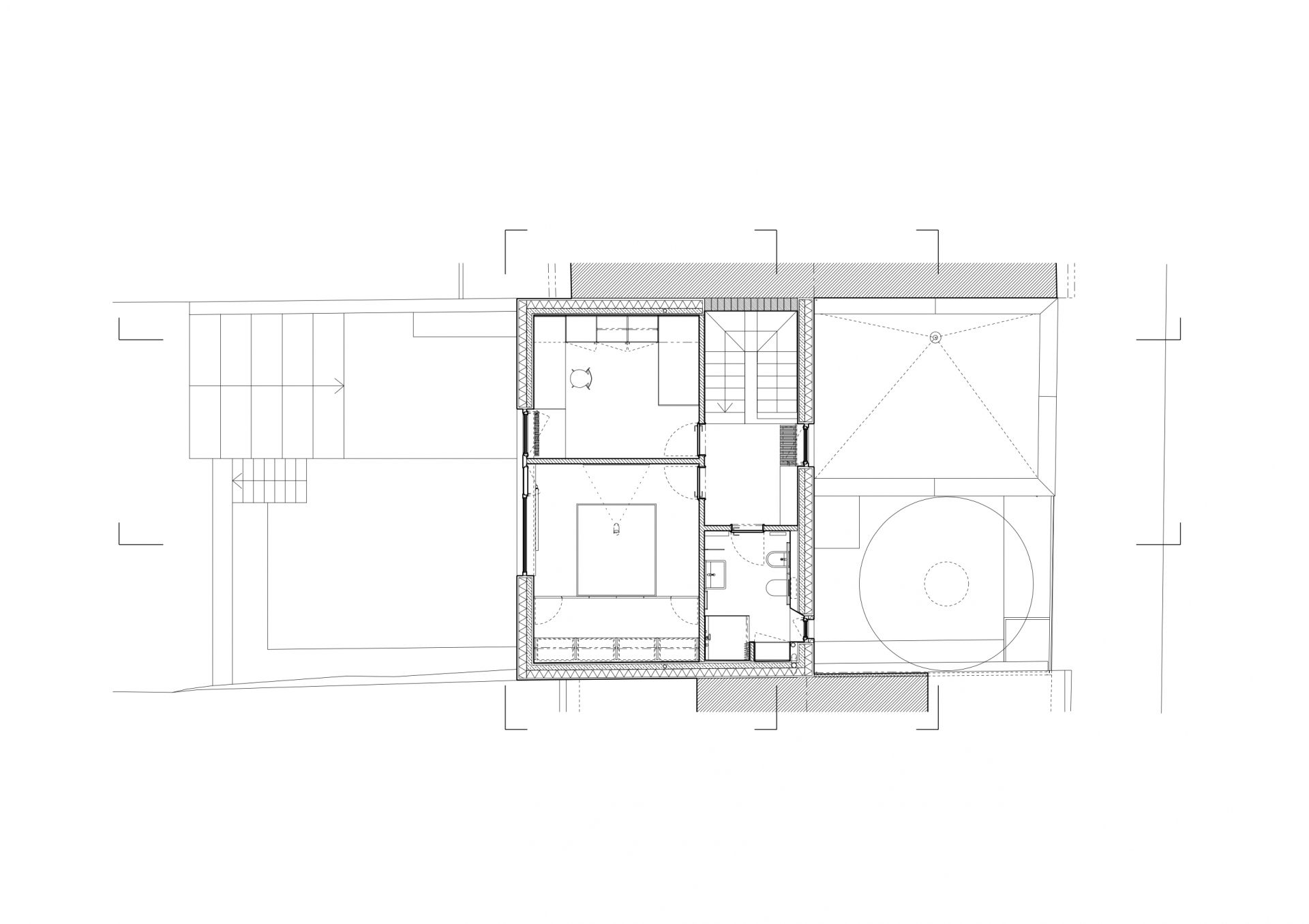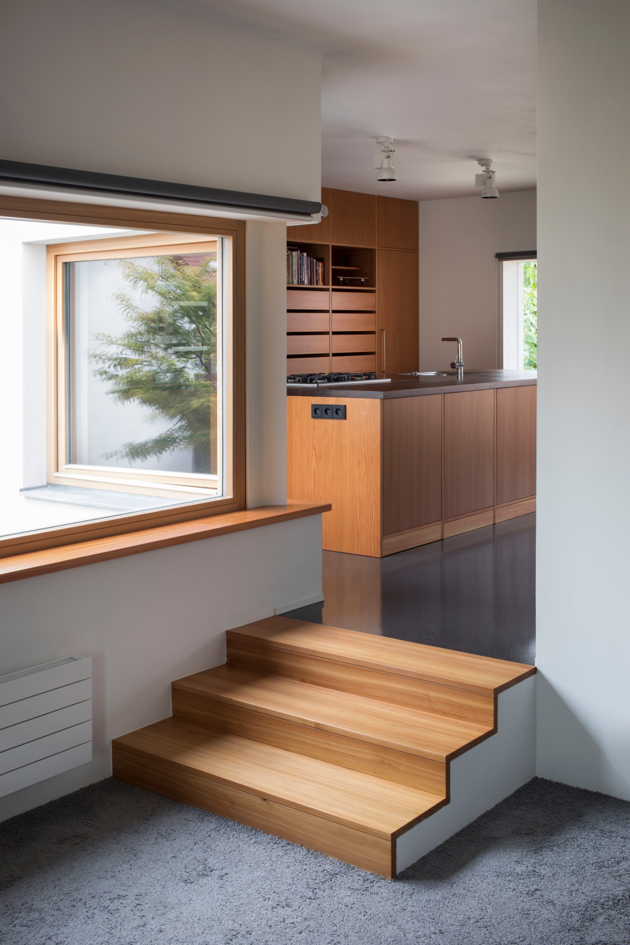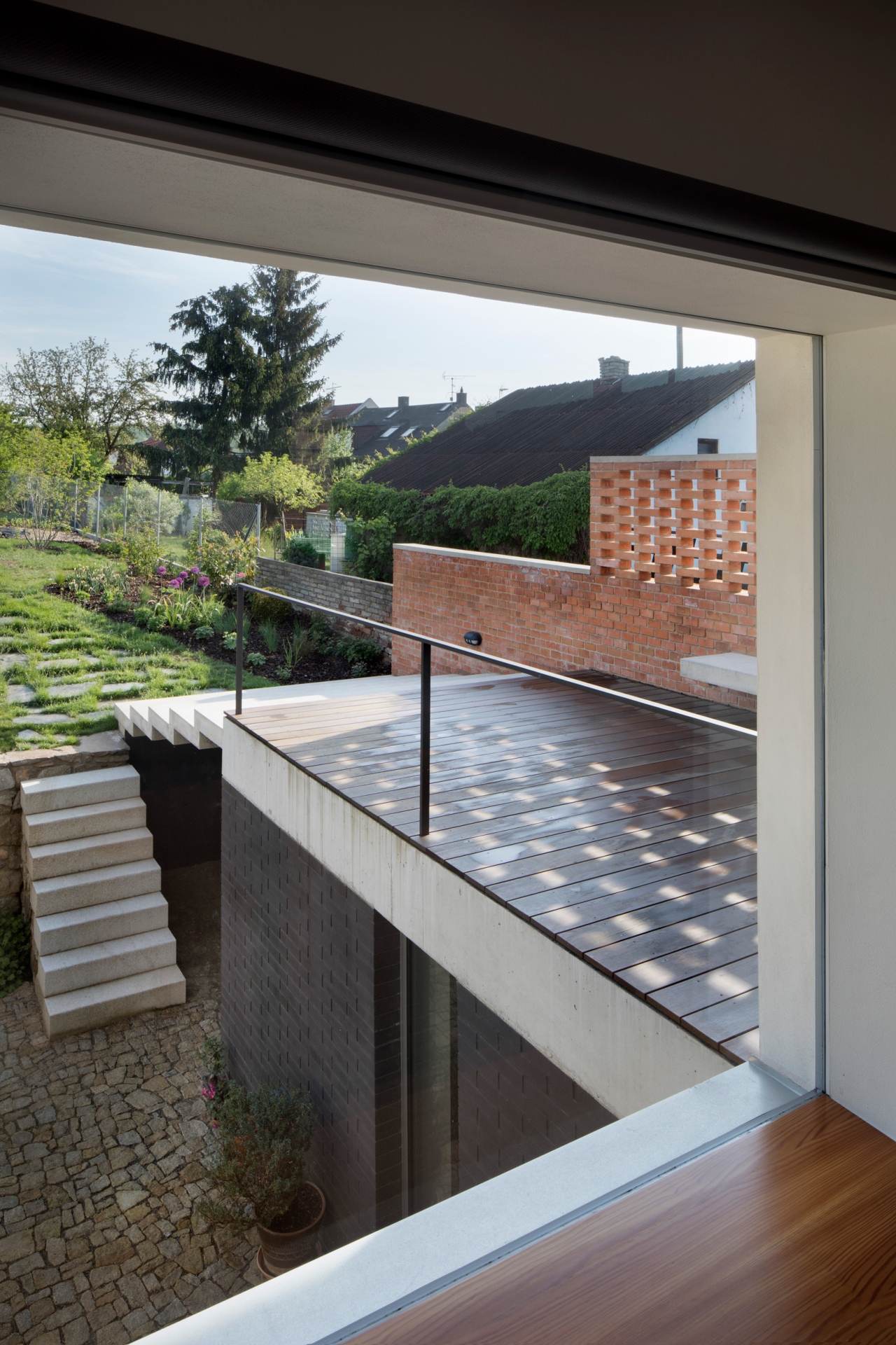 Stavět dům v proluce bylo naším snem. Po koupi starého řadového domu, který jsme pak zbourali, v jedné z mála lokalit Benešova s původní zástavbou poblíž středu města, jsme konečně mohli začít s jeho návrhem. Koncept domu se zrodil ještě ten den, kdy jsme si pozemek poprvé prohlédli a v podstatě už se nezměnil. Na ateliéru (příležitosném pokoji pro hosty), garáži a zázemí domu je posazena obytná část s polozapuštěným a převýšeným obývacím pokojem, kuchyní a jídelnou propojenou se zahradou a nad tím klidová část - koupelna a dvě ložnice obrácené do zahrad. Uliční fronta stávajících domů má jen jedno společné a to, že každý je zcela jiný. I proto jsme se rozhodli prolomit část hmoty průčelí ve prospěch vstupního dvorku. Ten poskytuje zklidněný vstup do domu, příjemné průhledy z ateliéru a v patře odstup obytné části od ulice s přirozeným stíněním jižního sluníčka korunou našeho stromu. Dvůr od ulice dělí plechová brána. Jednotlivé části domu záměrně výškově navazují na okolní římsy a hřebeny a utváří řád v protiváze k prolomení hmoty v ulici. Součástí domu je i původní kamenný sklípek.