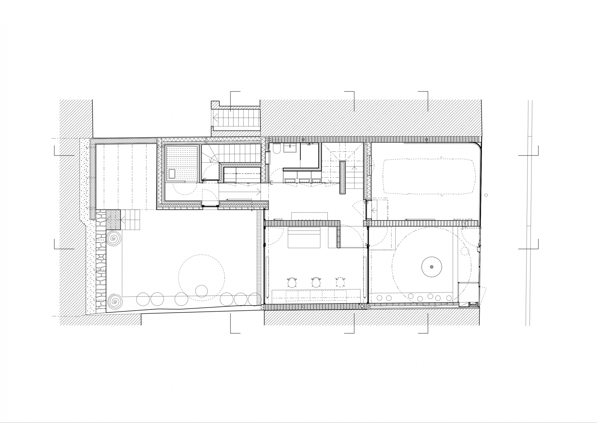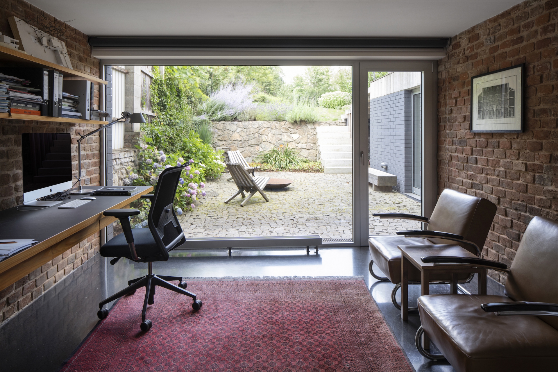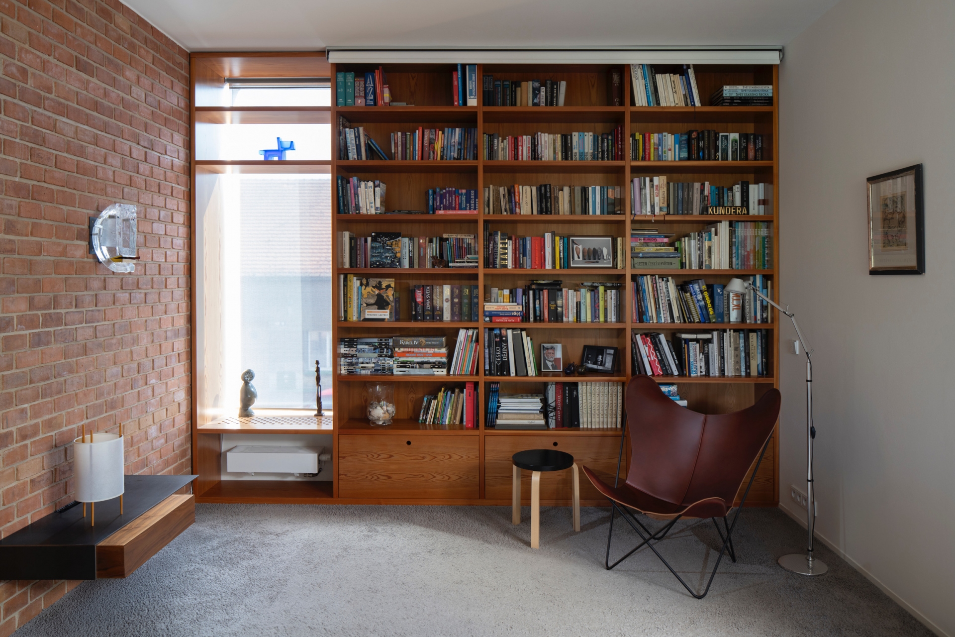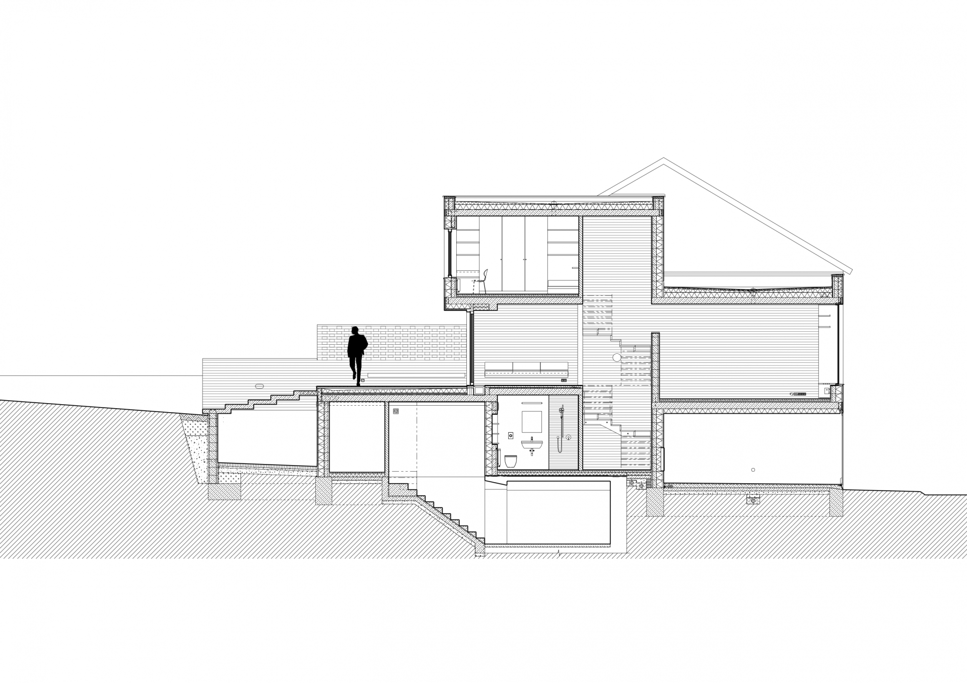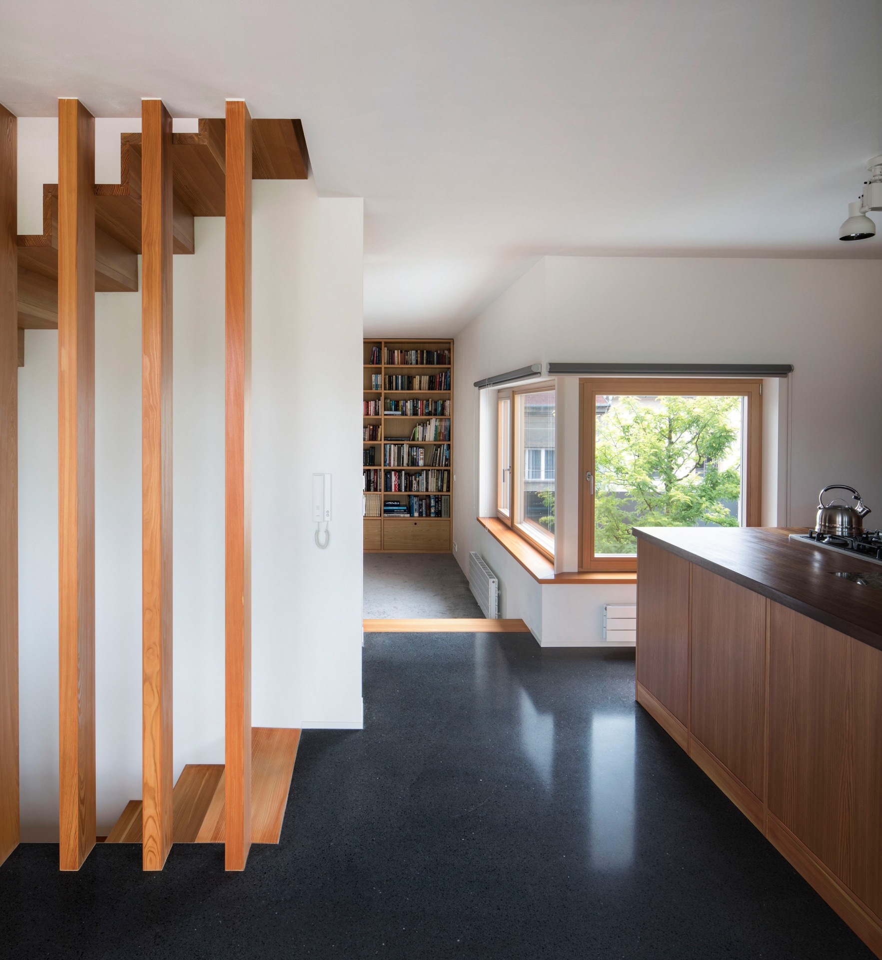 Stavět dům v proluce bylo naším snem. Po koupi starého řadového domu, který jsme pak zbourali, v jedné z mála lokalit Benešova s původní zástavbou poblíž středu města, jsme konečně mohli začít s jeho návrhem. Koncept domu se zrodil ještě ten den, kdy jsme si pozemek poprvé prohlédli a v podstatě už se nezměnil. Na ateliéru (příležitosném pokoji pro hosty), garáži a zázemí domu je posazena obytná část s polozapuštěným a převýšeným obývacím pokojem, kuchyní a jídelnou propojenou se zahradou a nad tím klidová část - koupelna a dvě ložnice obrácené do zahrad. Uliční fronta stávajících domů má jen jedno společné a to, že každý je zcela jiný. I proto jsme se rozhodli prolomit část hmoty průčelí ve prospěch vstupního dvorku. Ten poskytuje zklidněný vstup do domu, příjemné průhledy z ateliéru a v patře odstup obytné části od ulice s přirozeným stíněním jižního sluníčka korunou našeho stromu. Dvůr od ulice dělí plechová brána. Jednotlivé části domu záměrně výškově navazují na okolní římsy a hřebeny a utváří řád v protiváze k prolomení hmoty v ulici. Součástí domu je i původní kamenný sklípek.
