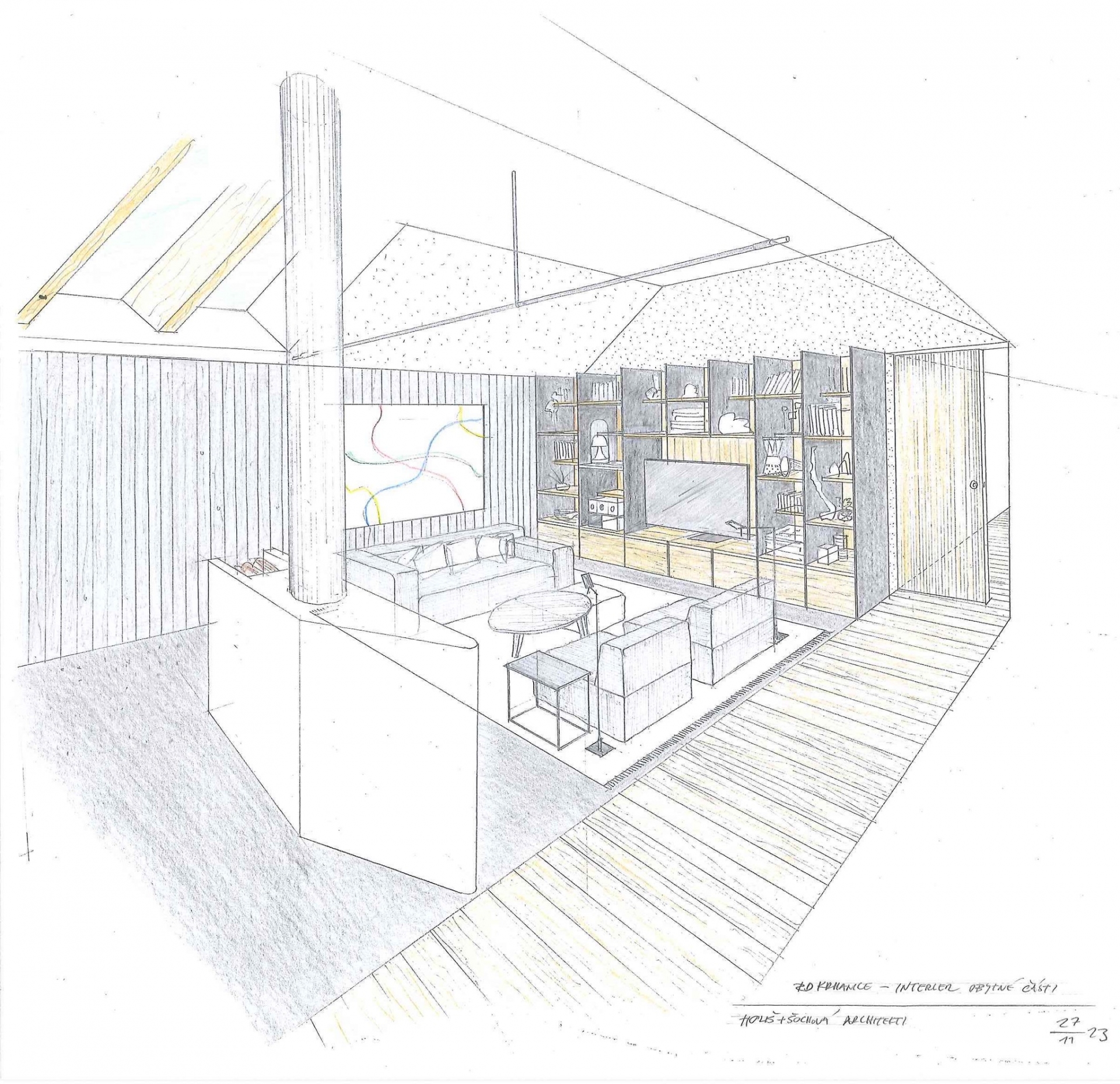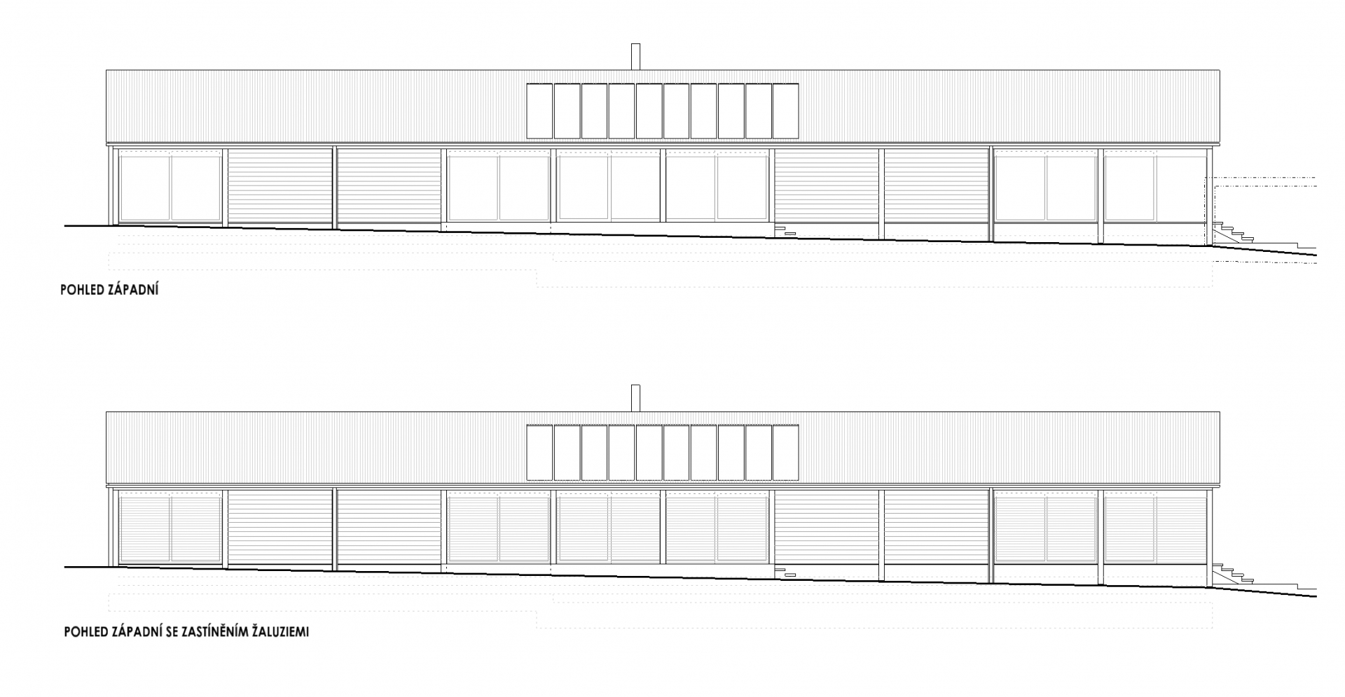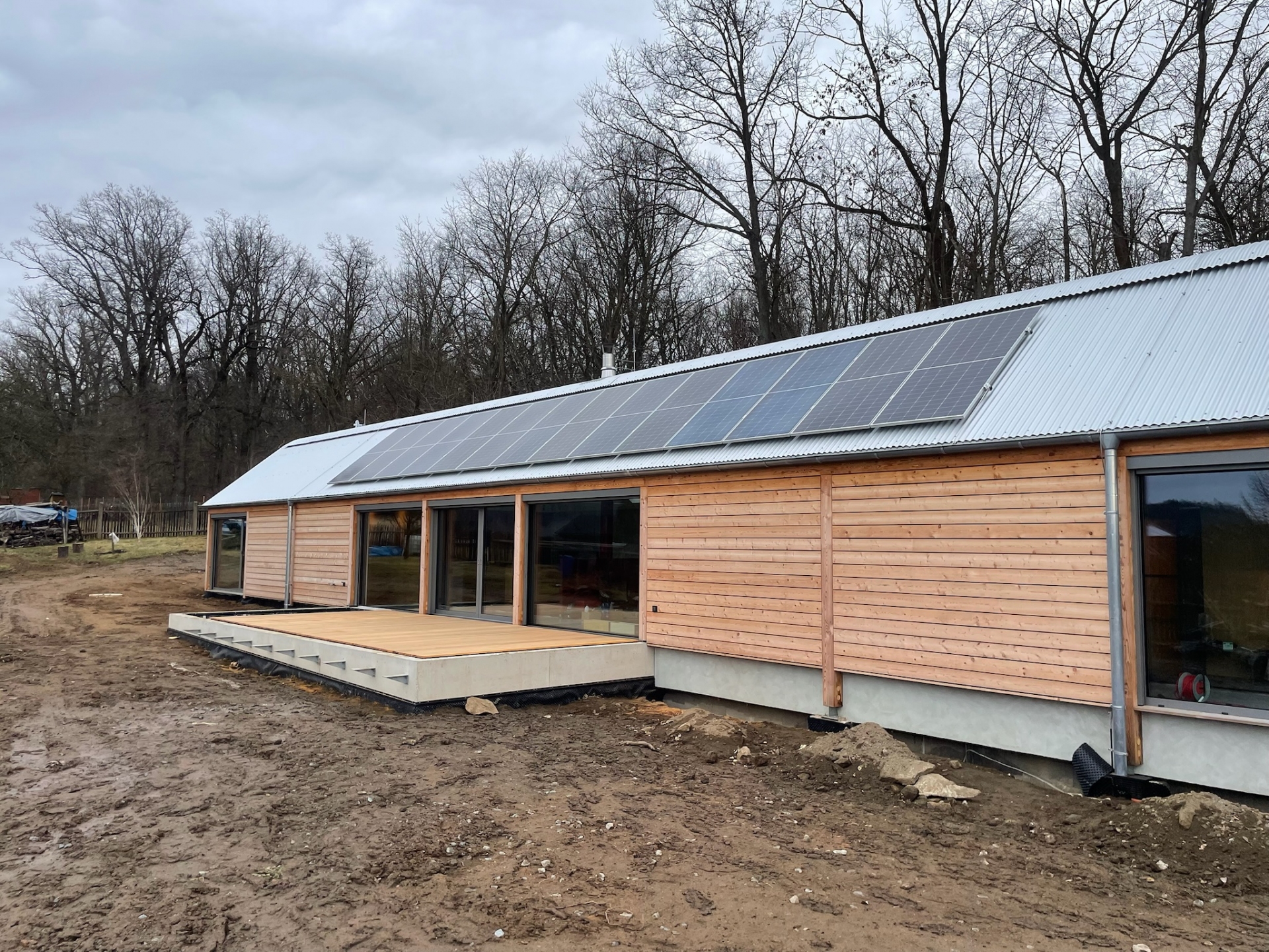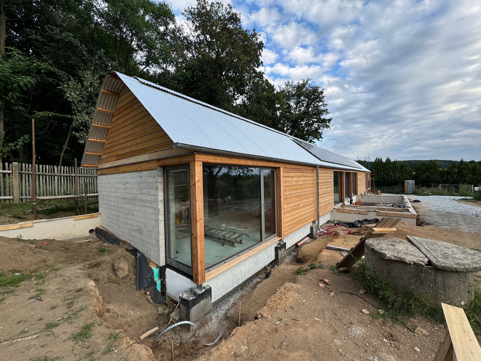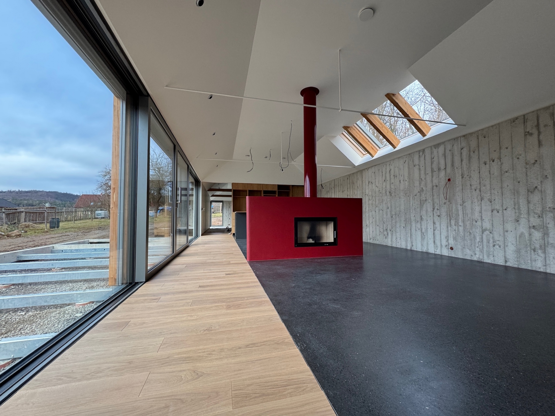Jednopodlažní dům pro čtyřčlennou rodinu v rodném místě. Původní projekt velkorysého domu s plochou střechou musel být přepracován na dům se střechou sedlovou s ohledem na změnu územního plánu obce. Podélný přízemní dům vedle lesíka s orientací na západ do zahrady na okraji obce. Dům z pohledové betonové sendvičové obvodové stěny, k níž je vše ostatní přimknuto - dřevostavba s plechovou střechou se skutečným sedlem ve svém vrcholu. Dům s výraznými detaily - červeným krbem, betonovou stěnou, střechou z vlnitého plechovou a nábytkem místo stěn. Dům pro moderní rodinu, která se tady, v malé obci nedaleko Prahy, bude cítit dobře.