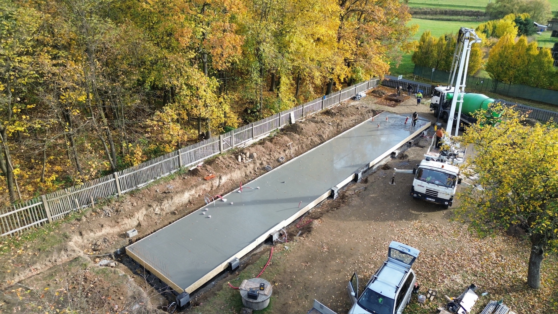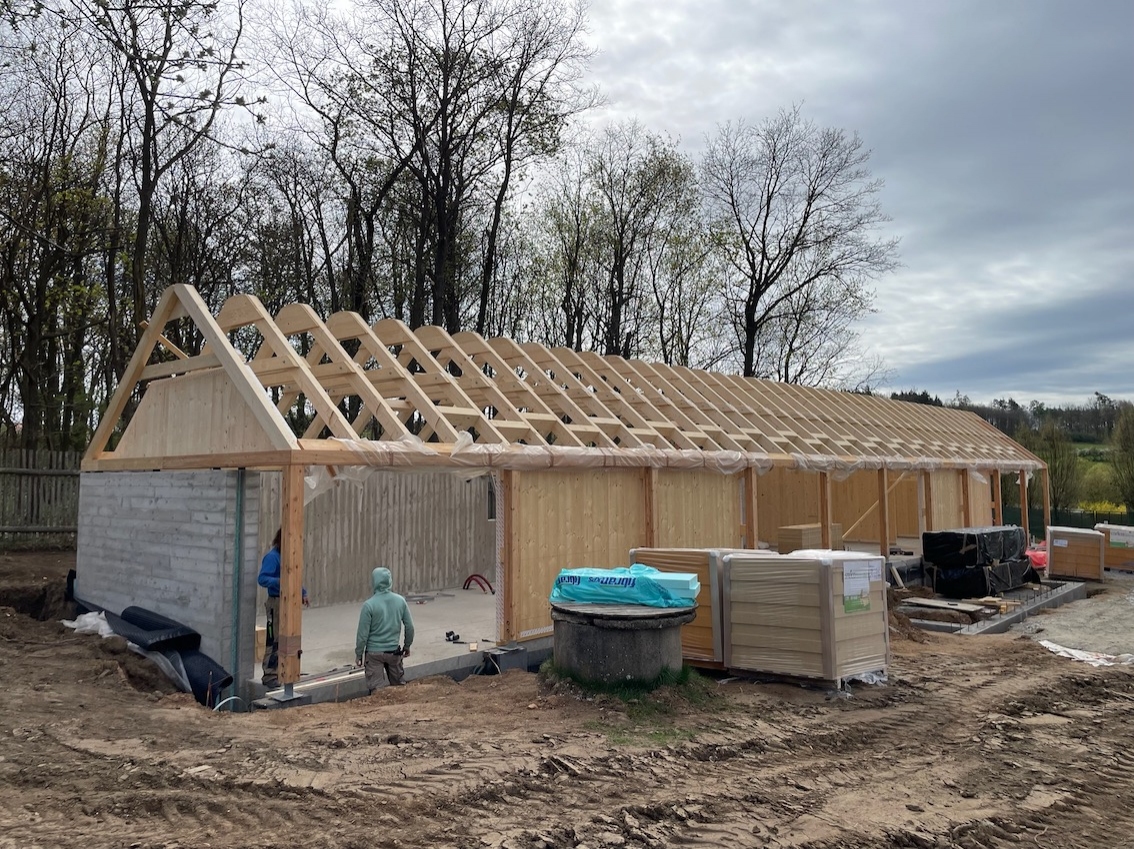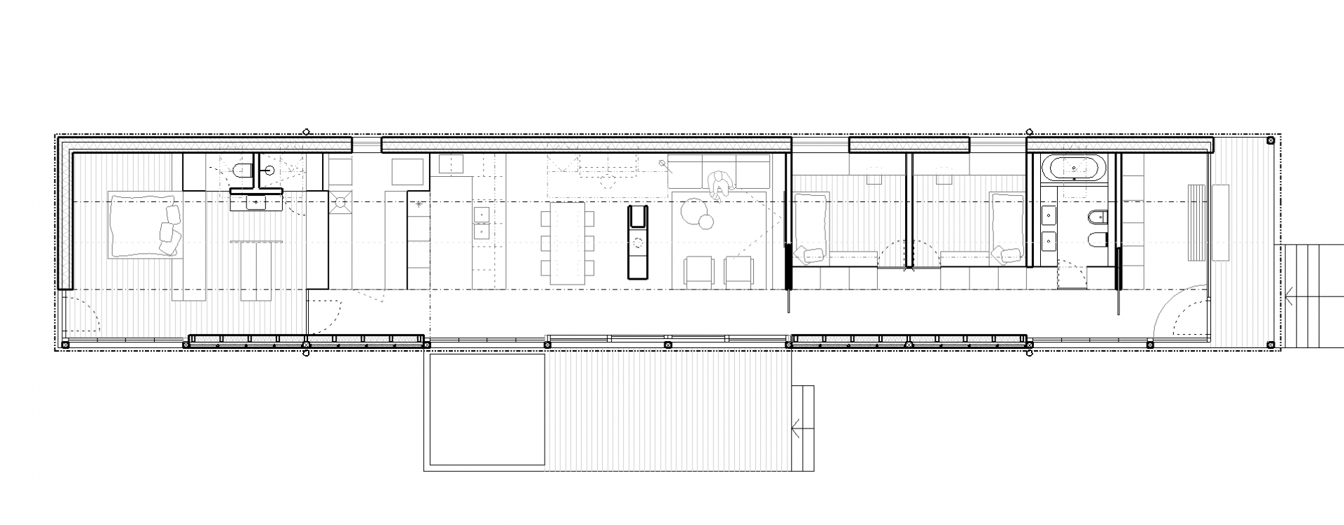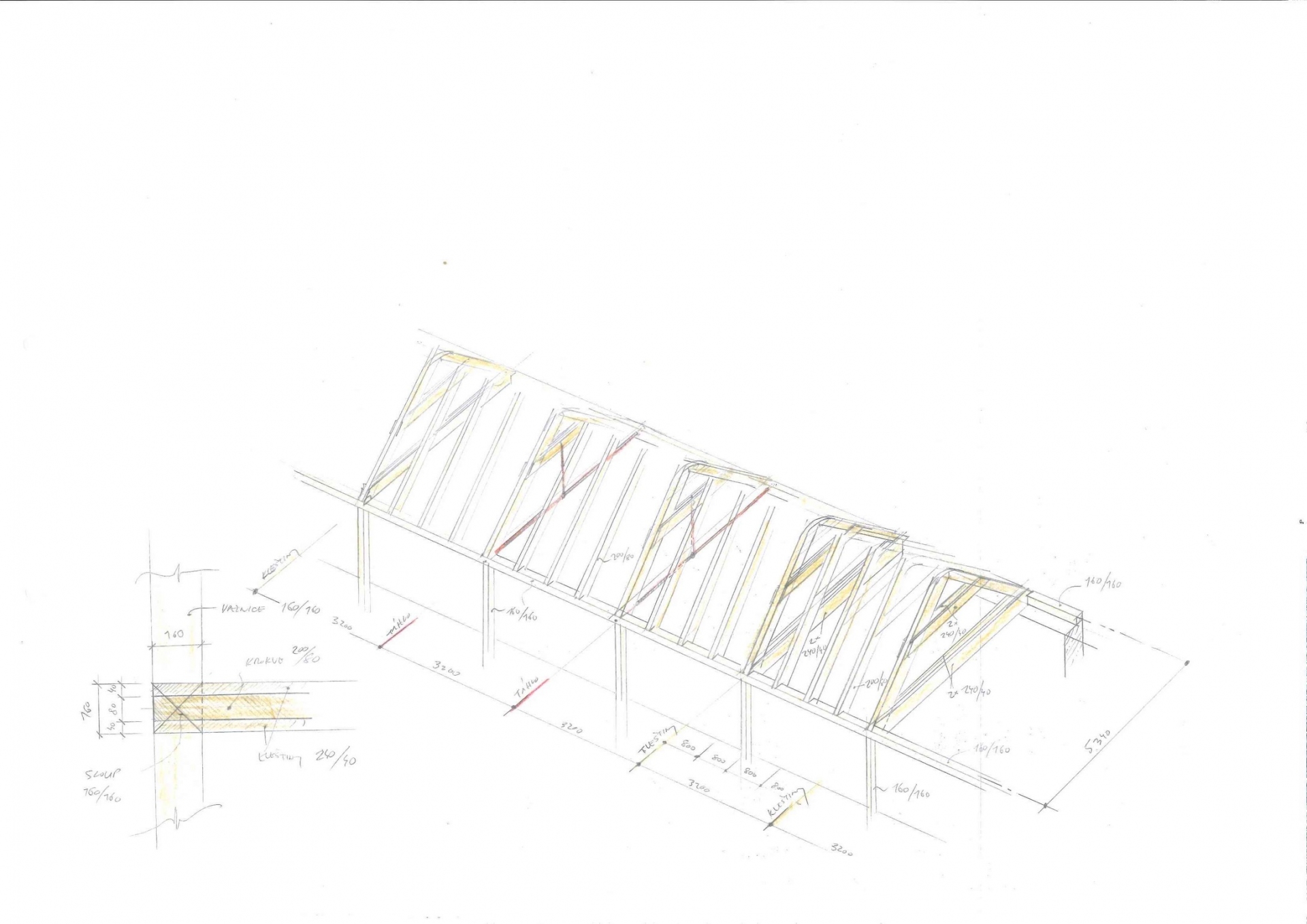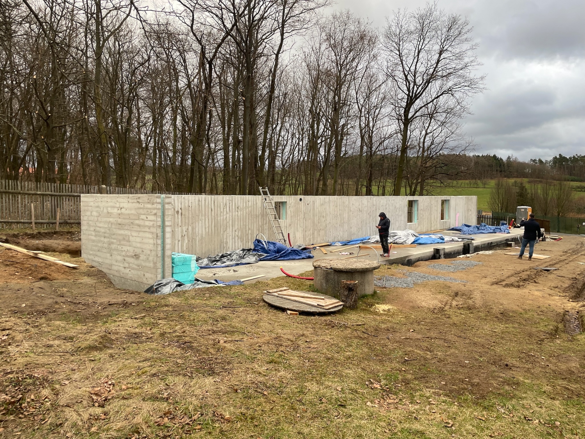 Jednopodlažní dům pro čtyřčlennou rodinu v rodném místě. Původní projekt velkorysého domu s plochou střechou musel být přepracován na dům se střechou sedlovou s ohledem na změnu územního plánu obce. Podélný přízemní dům vedle lesíka s orientací na západ do zahrady na okraji obce. Dům z pohledové betonové sendvičové obvodové stěny, k níž je vše ostatní přimknuto - dřevostavba s plechovou střechou se skutečným sedlem ve svém vrcholu. Dům s výraznými detaily - červeným krbem, betonovou stěnou, střechou z vlnitého plechovou a nábytkem místo stěn. Dům pro moderní rodinu, která se tady, v malé obci nedaleko Prahy, bude cítit dobře.